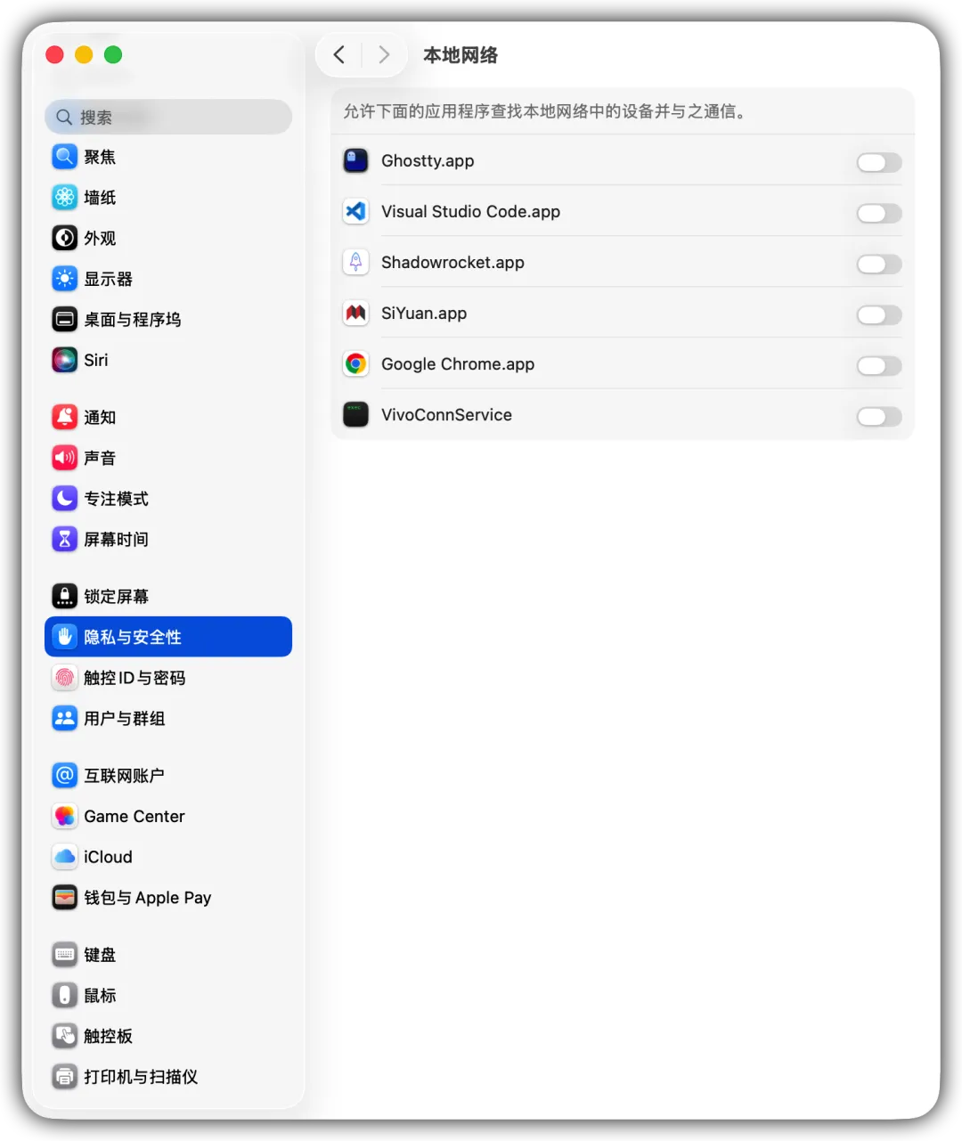 重启后打开 系统设置 → 隐私与安全性 → 本地网络: