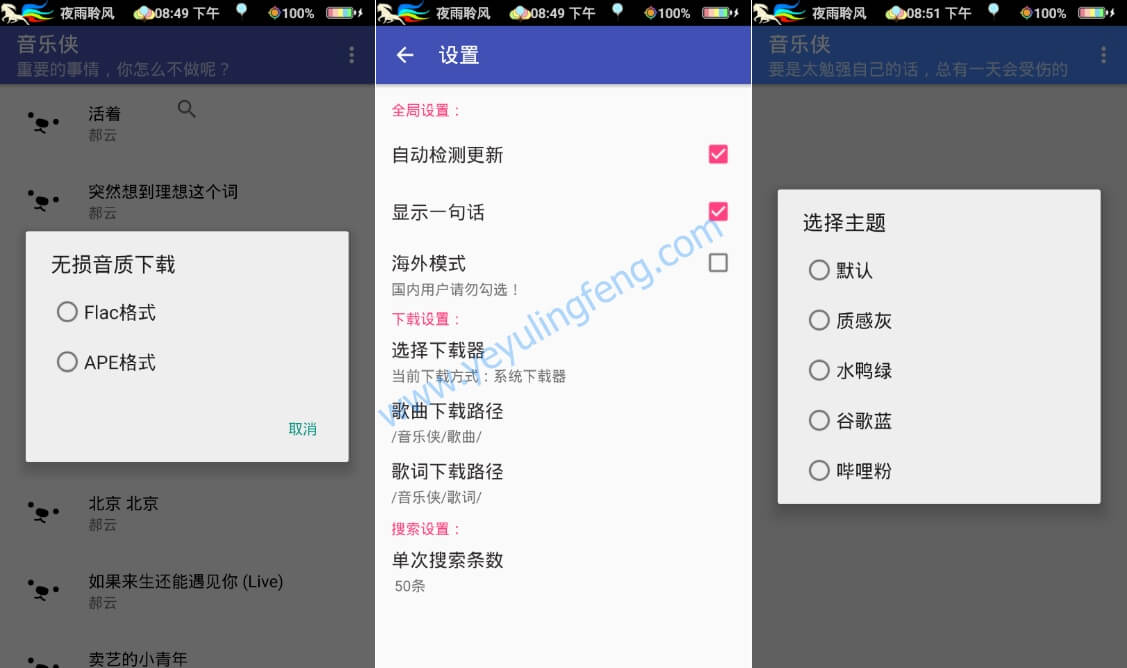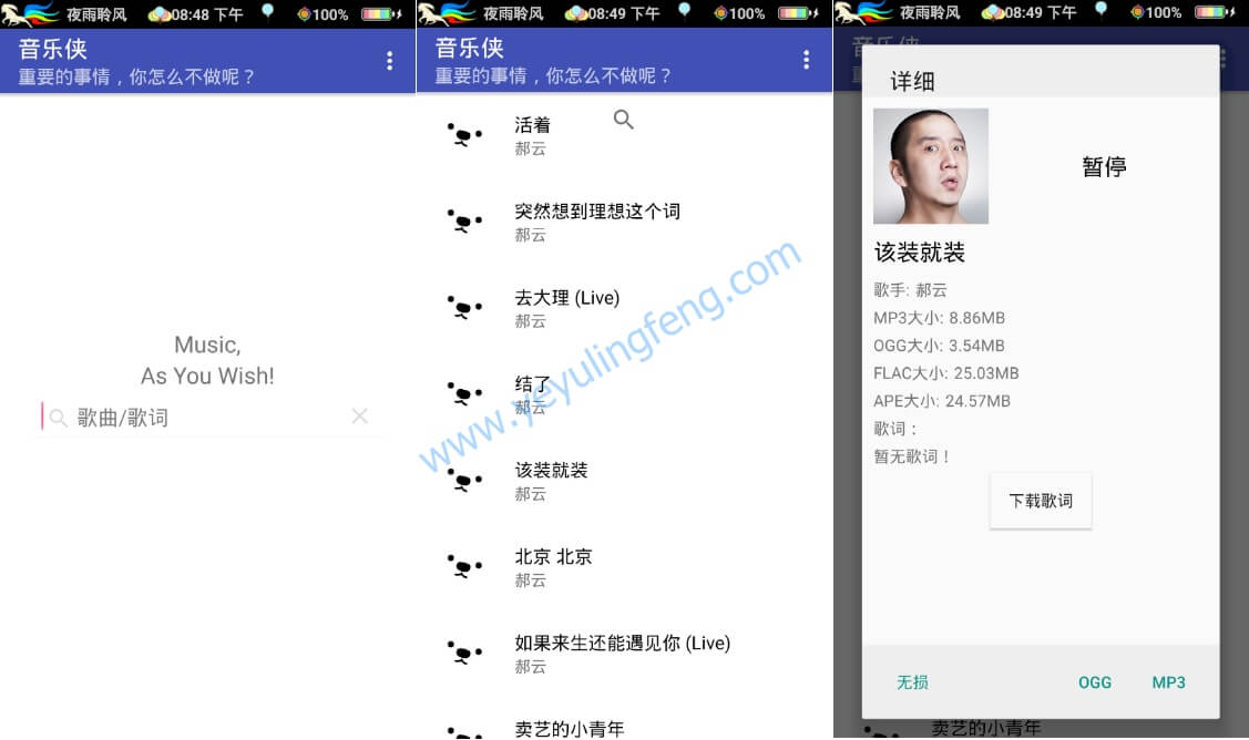 最近想下载几首歌曲,但是老夜发现之前的音乐迷和音乐狂作者已经将软件服务关闭了,为此惋惜几秒钟这里继续为大家推荐一款无损音乐的下载工具,注意字眼是无损 无损 无损音质,大部分第三方音频下载应用是达不到下载无损音质的,而音乐侠这款新出的应用正好解决大大家所需,除了普通标准MP3格式还支持Flac和APE无损音质下载至本地,关于Flac和APE大家也无需刻意研究,只要知道是一种无损格式介质就行了,有着压缩率高编码精准同时文件占用也是远远甩MP3格式几倍之多,最最最重要的就是比较考验播放器的解码能力。扯到这里大家是不是更糊涂了,没关系反正音乐侠APP支持多种格式可以随心所欲的畅快下载至本地啦~~~