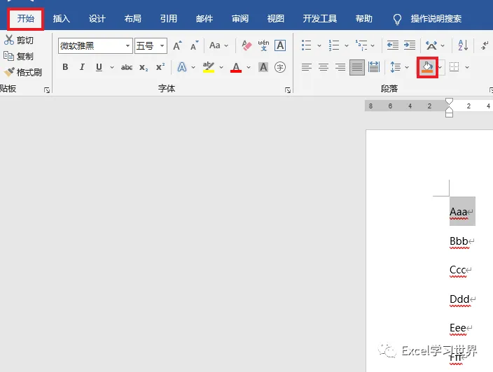 2. 选择菜单栏的“开始”–> 选择“段落”功能区的“底纹”