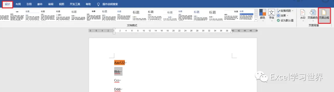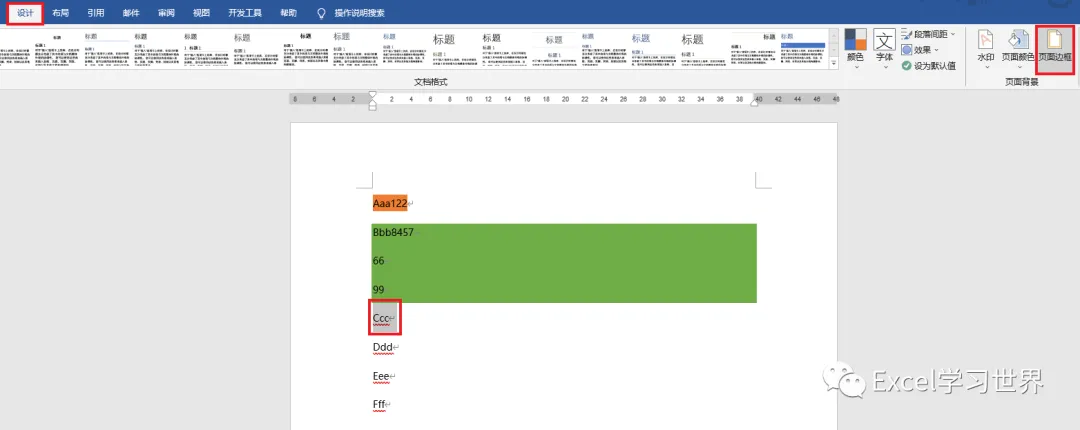 1. 选中需要设置底纹的区域 –> 选择菜单栏的“设计”–> 选择“页面背景”功能区的“页面边框”