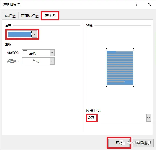 2. 在弹出的对话框中选择“底纹”选项卡 –> 在“填充”区域选择所需的颜色 –> 右下角的“应用于”菜单中已经默认选中了“段落”–> 点击“确定”