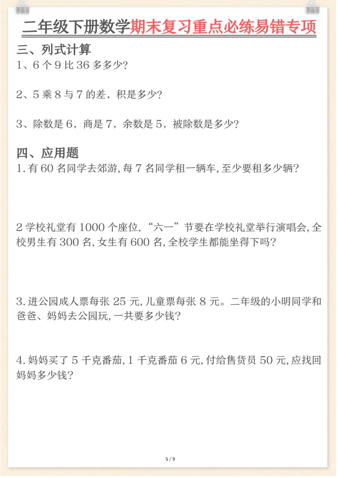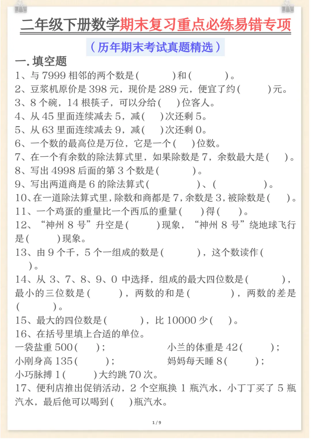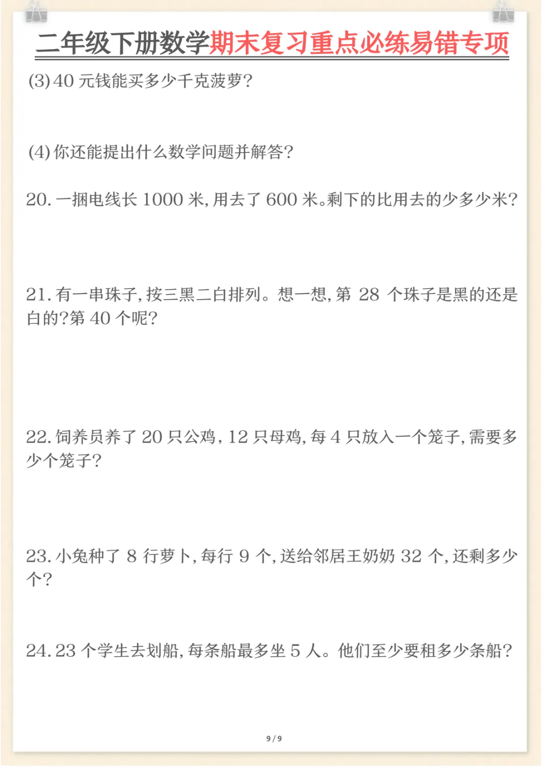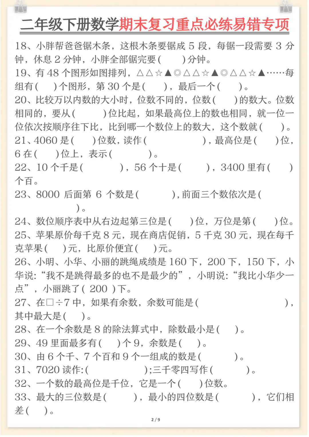 二年级下数学期末复习重点必练1,共9页,电子版可下载可打印,这份期末复习专项练习紧扣二年级数学下册复习需求,涵盖多个核心知识点与专项训练内容,适合孩子在考前进行系统梳理与集中巩固,帮助查漏补缺、强化重点、提升解题熟练度。需要的家长可以及时下载打印出来,让孩子练一练,更高效地做好期末复习准备。
