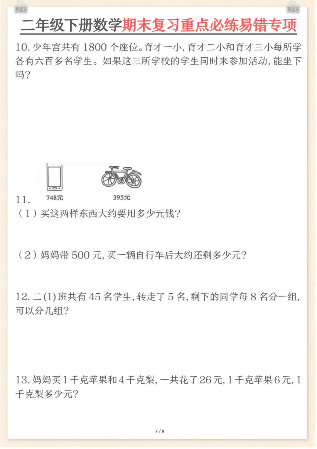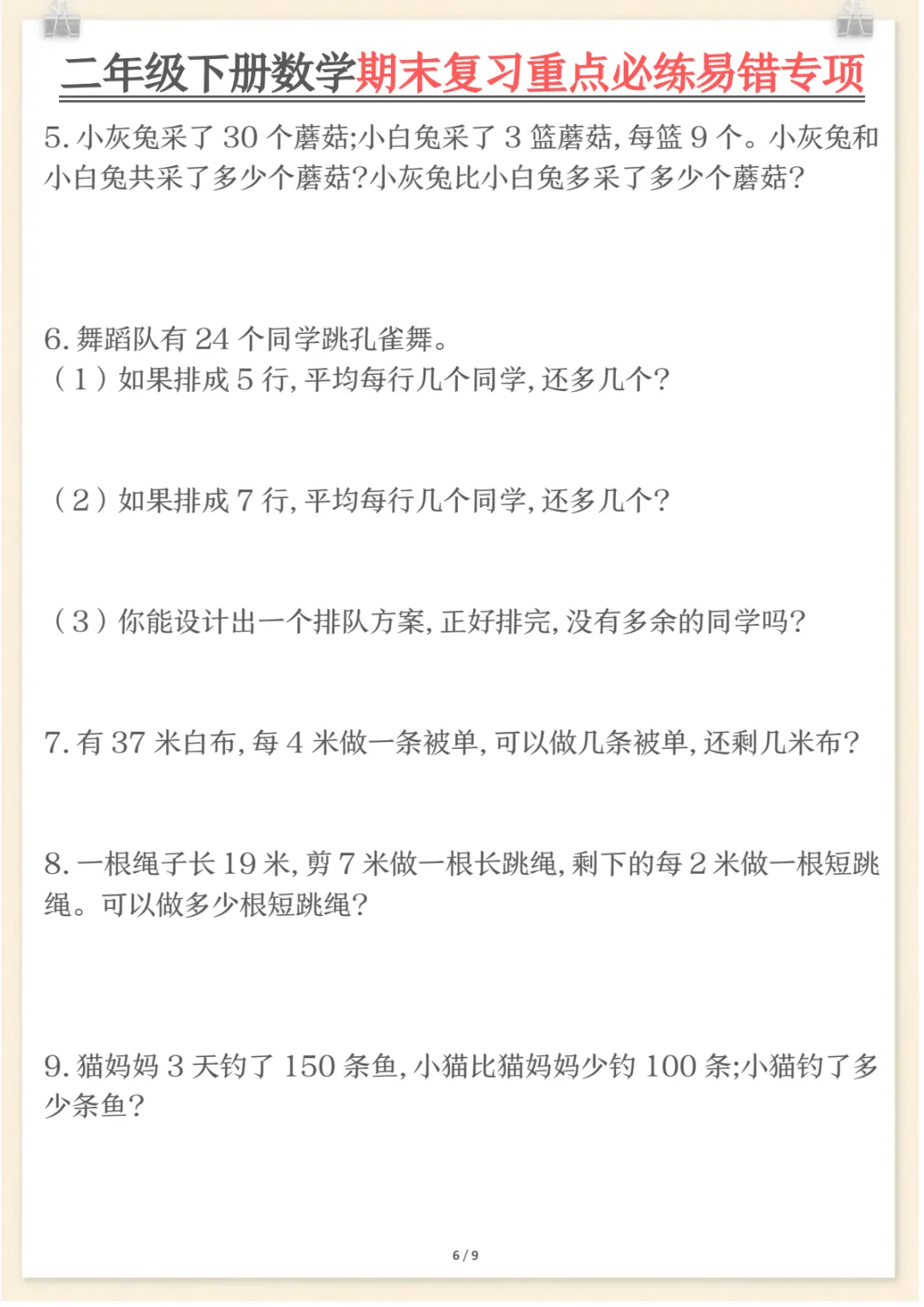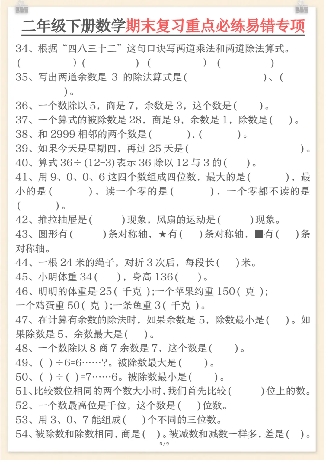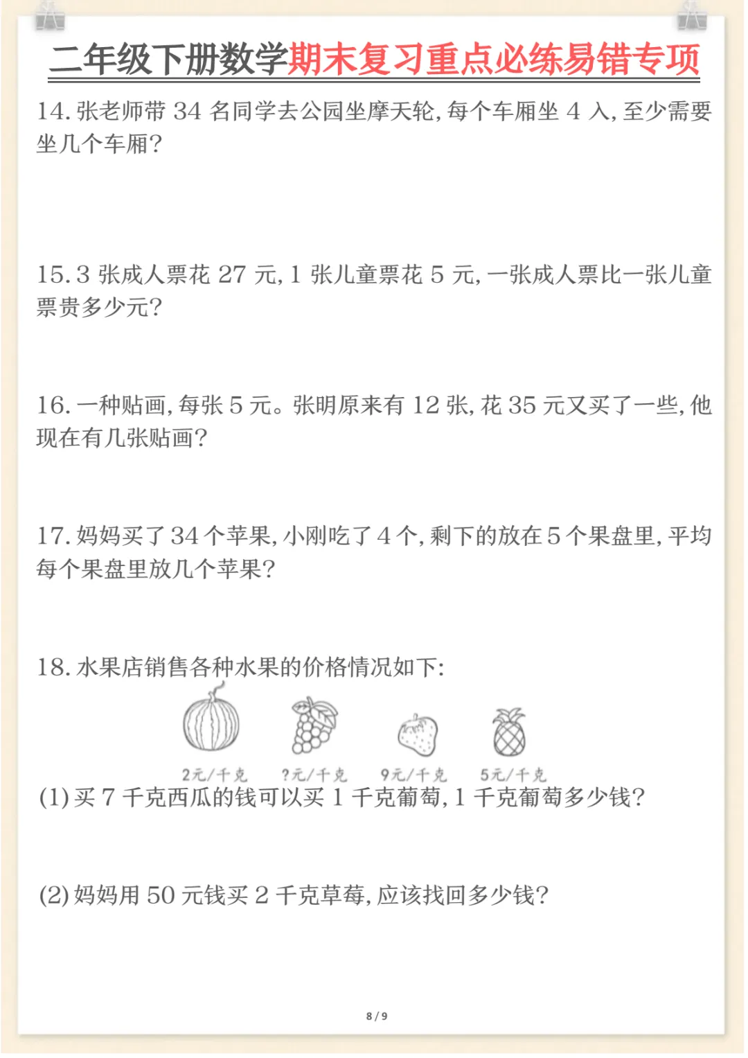 二年级下数学期末复习重点必练1,共9页,电子版可下载可打印,这份期末复习专项练习紧扣二年级数学下册复习需求,涵盖多个核心知识点与专项训练内容,适合孩子在考前进行系统梳理与集中巩固,帮助查漏补缺、强化重点、提升解题熟练度。需要的家长可以及时下载打印出来,让孩子练一练,更高效地做好期末复习准备。