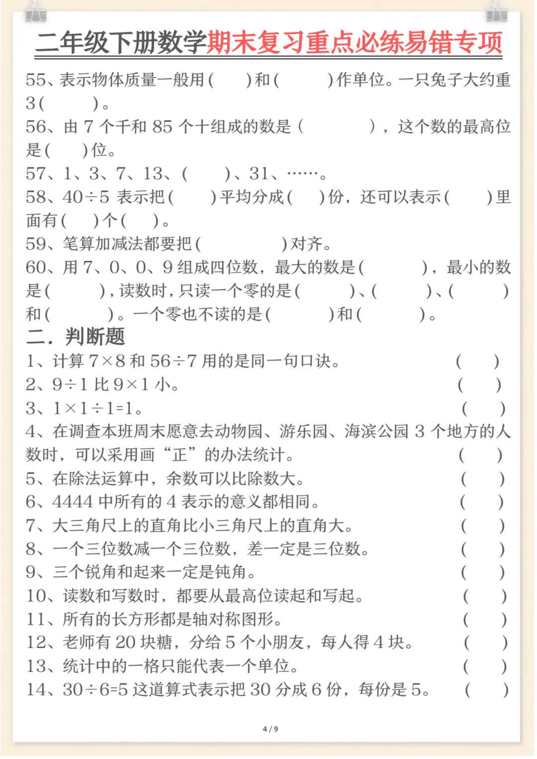 二年级下数学期末复习重点必练1,电子版可打印