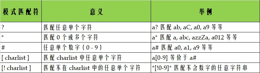 string 是任意字符串,pattern 也是一个字符串,其中含有模式匹配操作符。Like 操作符的结果类型是 Boolean 类型:如果字符串 string 匹配模式 pattern,则返回 True,否则,返回 False。pattern 中的模式匹配符列于下表:图1 Like 中的模式匹配符了解了 Like 中的模式匹配符,现在再来看上面的例子,就容易理解了。ro.Value Like Empty:这是单元格为空的情况(Empty 表示空字符串),此时设置单元格背景为白色。IsNumeric(ro.Value) And Not (ro.Value Like “*[!0-9]*”):这是由两个 Boolean 表达式由 And 和 Not 逻辑操作符组合起来的复杂 Boolean 表达式,可以简化为:A And Not B。这里 A 等于 IsNumeric(ro.Value),B 等于 (ro.Value Like “*[!0-9]*”)。IsNumeric 是 VBA 函数,作用是判断给定的值是否是数值。所以 IsNumeric(ro.Value) 就是判断单元格 ro 中的值是不是数值。这里的“数值”指浮点数值,即可以包含小数点以及指数,如 IsNumeric(3.5E10) 返回 True,IsNumeric(“23”) 也返回 True,但 IsNumeric(“23 Help”) 则返回 False。所以,IsNumeric(ro.Value) 用来判断单元格 ro 中的值是不是数值。对于表达式 ro.Value Like “*[!0-9]*”,我们先来看看模式字符串 “*[!0-9]*”,根据图1,这个模式匹配不含数字的任意字符串,所以表达式 ro.Value Like “*[!0-9]*” 的意思是单元格的值不含数字。Not (ro.Value Like “*[!0-9]*”) 的意思是单元格的值只含有数字。两个子表达式组合起来,IsNumeric(ro.Value) And Not (ro.Value Like “*[!0-9]*”) 的意思:单元格 ro 的值是数值,并且只含有 0-9 的数字。简单一句话,就是单元格 ro 的值是任意大小的非负整数。如果单元格的值满足这个条件,则单元格的背景就设置为红色。ro.Value Like “[a-z]*”:模式 [a-z]* 表示“以小写字母开头,后面跟有 0 个或多个任意字符”组成的字符串。如果单元格的值满足这个模式,则背景设置为青色。ro.Value Like “[A-Z]*”:模式 [A-Z]* 表示“以大写字母开头,后面跟有 0 个或多个任意字符”组成的字符串。如果单元格的值满足这个模式,则背景设置为橘色。要注意的是,模式 [a-z]* 和 [A-Z]* 的作用依赖于字符串比较方式的设置。如果当前字符串的比较方式设置为: