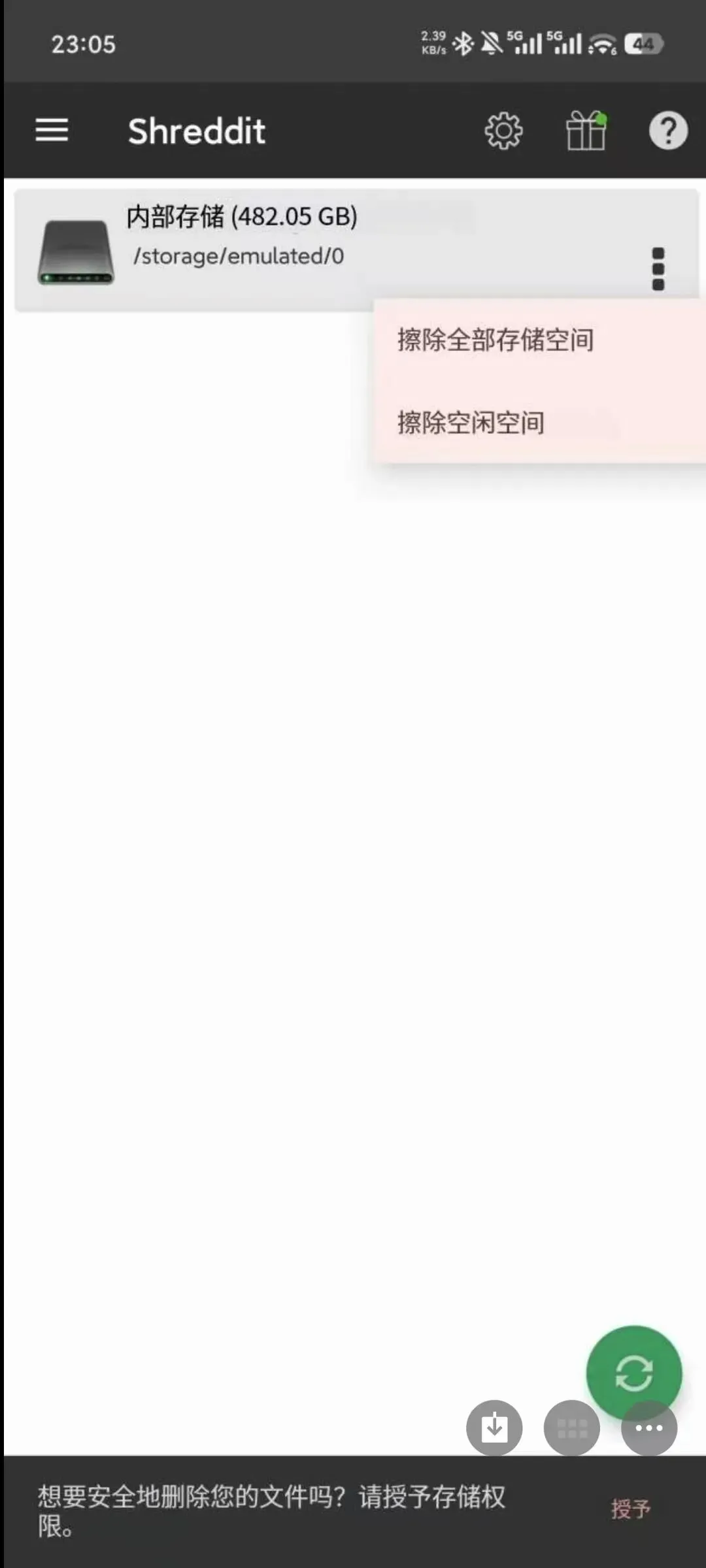 只要授权存储权限,然后我们点击三个点那里。选择第一个“擦除全部存储空间”就可以。千万千万记住,不要在自己经常使用的手机上用。到时候哭着找方法恢复