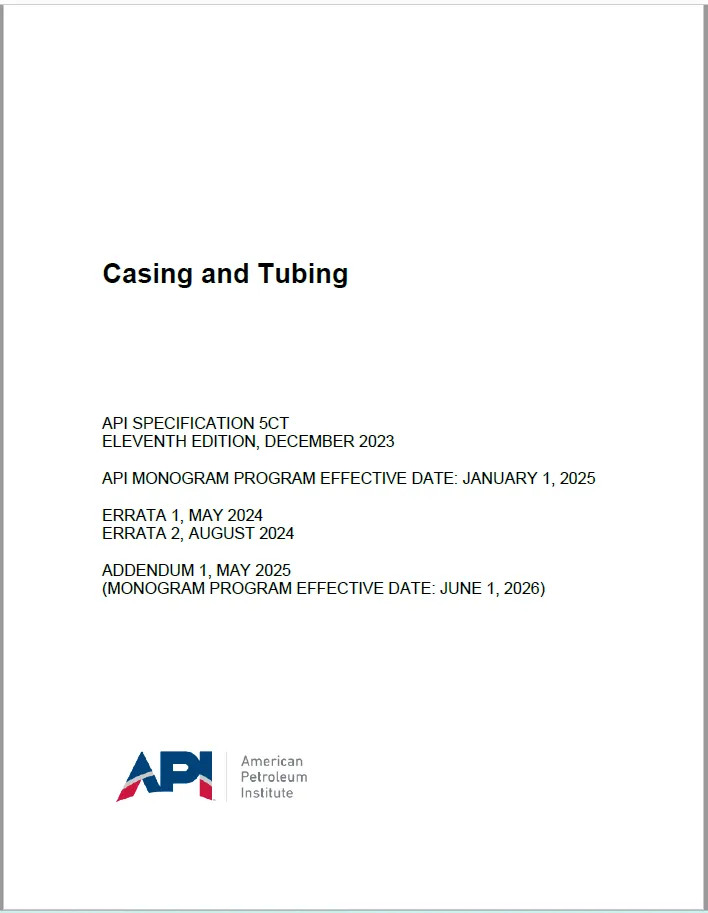 Amendments, rulings, and supplements: API Spec 5CT Addendum 1 (2025), API Spec 5CT Errata 2 (2024), API Spec 5CT Errata 1 (2024)