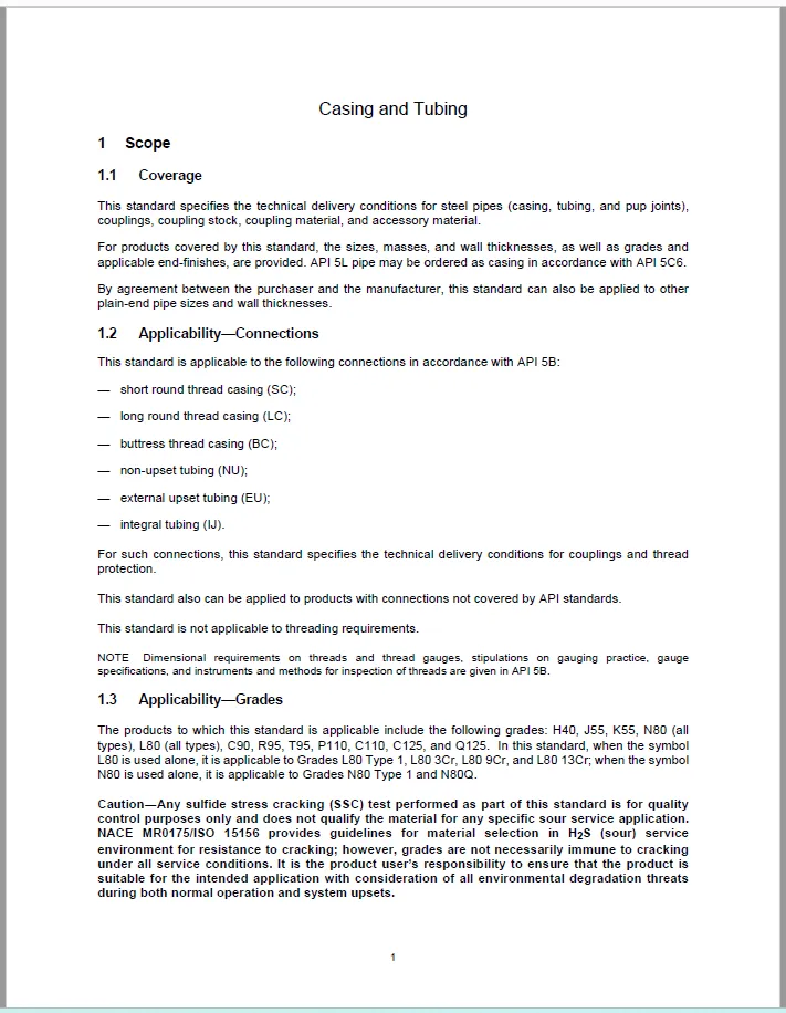 This standard specifies the technical delivery conditions for steel pipes (casing, tubing, and pup joints), coupling stock, coupling material, and accessory material.