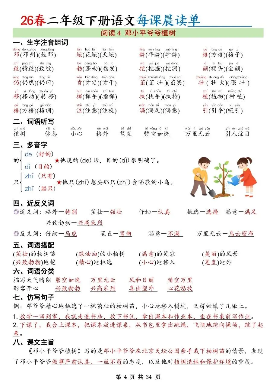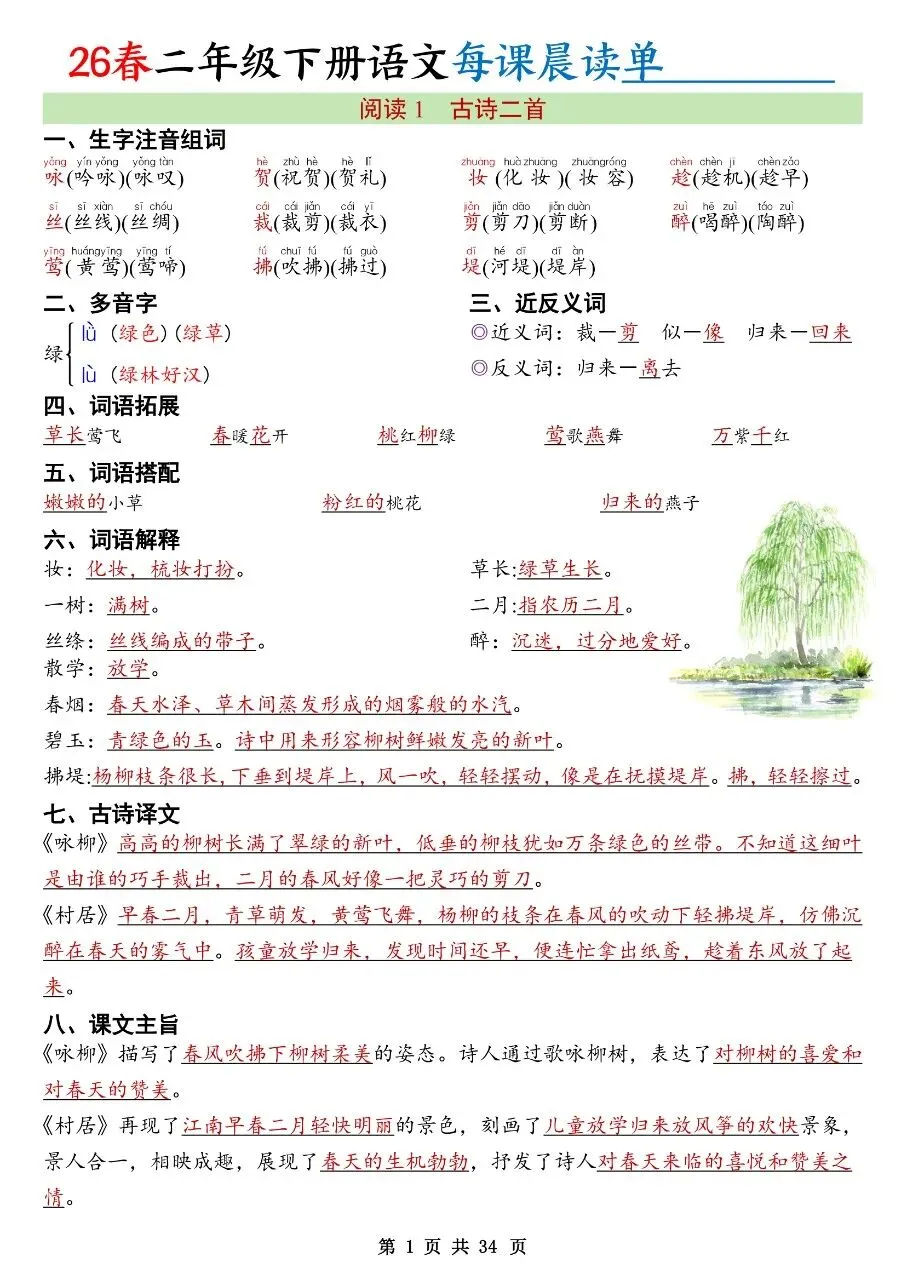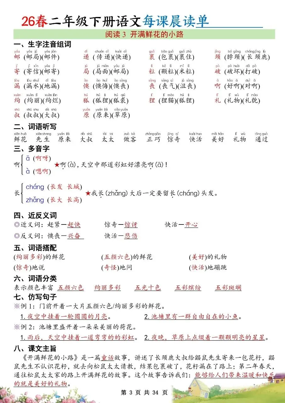 二年级下册语文|26春每课晨读单(可下载打印) 小学资料每日更新,具体看完整PDF版本 (温馨提示:文末👇有完整电子版下载🔗) 新版二年级下册语文 26春每课晨读单 △因篇幅有限,只展示部分资料截图△ ↓↓↓ 领取完整电子版: ①:点一点右下角的“👍”和“❤️”,感谢🙏 ②:在公众号对话框回复:1049 资料合集:👇👇 小学学习方法 二年级下册数学
