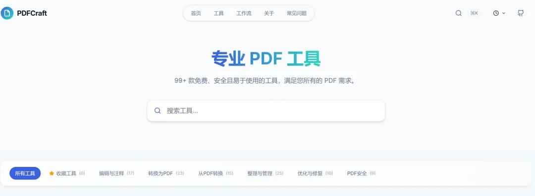 支持 PDF 内容编辑、电子签名、添加水印 / 页码 / 书签、生成目录、表单创建与填写、注释印章等17个工具。 - 2.格式转 PDF