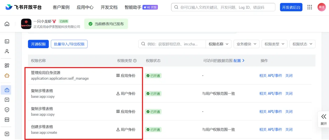 多维表格、日历、通讯录、文档、消息、邮箱、电子表格、任务、视频会议的常用权限一次开通。
