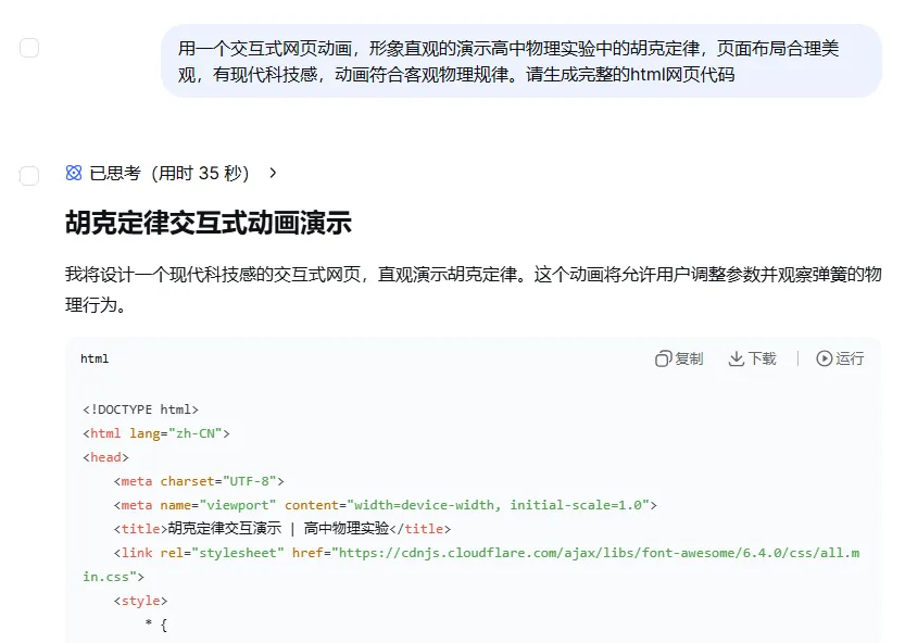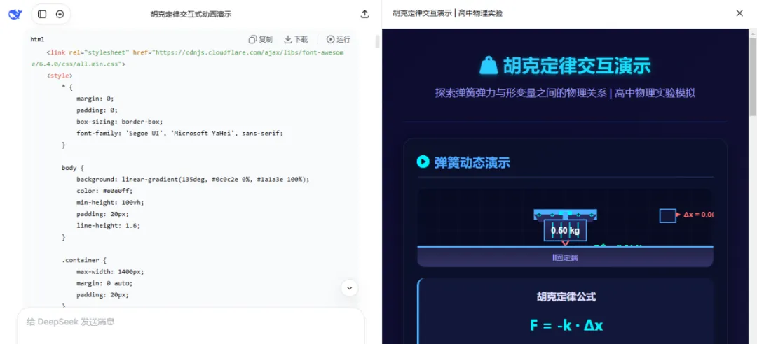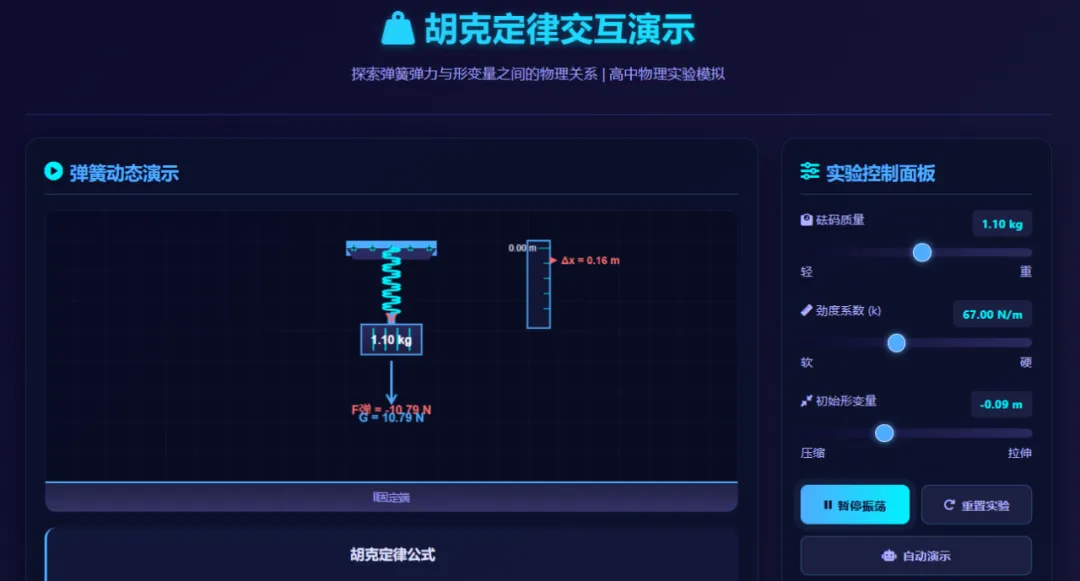 这是我用DeepSeek生成的一个,高中物理中经典实验《胡克定律》的网页动画:
