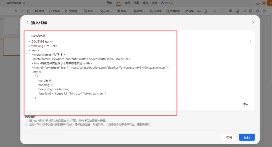 WPS里的这个一键插入HTML素材的功能,可以非常顺畅的,直接在PPT里运行这个网页动画。