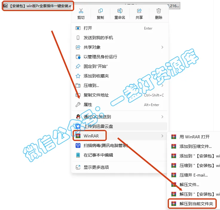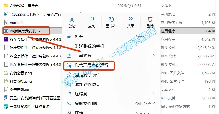 6.选中【PR插件点我安装.exe】文件,鼠标右键选择【以管理员身份运行】