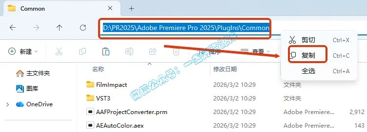 10.在打开的文件夹,依次打开【PlugIns—common】文件夹,然后选中地址栏的整个Pr安装路径地址,鼠标右键选择【复制】