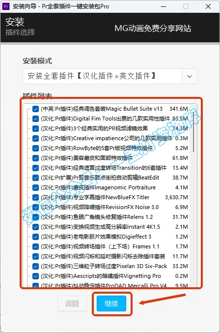 12.选择安装自己需要的插件,建议选择一些自己需要的插件即可,装太多没用的插件的话,可能会导致卡顿,(点击安装模式可以取消插件全选定义安装)点击【继续】