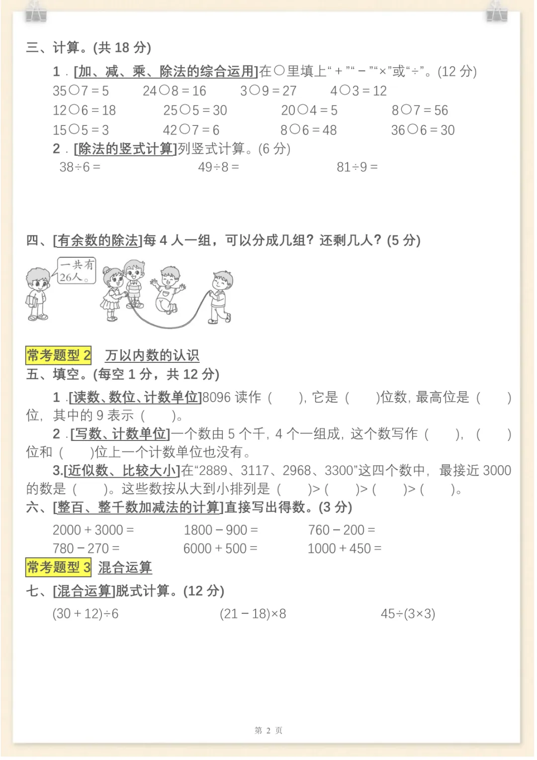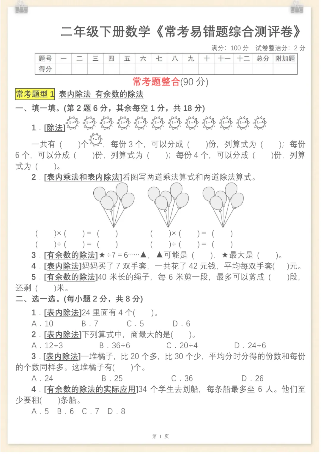 二年级下数学常考易错题综合测评卷,共5页,电子版可下载可打印,这份资料围绕二年级下册数学学习中的常考题型和易错内容进行整理,涵盖多个核心知识点与专项训练内容,适合孩子在阶段复习、查漏补缺和考前巩固时使用,帮助孩子进一步理清思路、规范答题、减少失分。需要的家长可以先收藏下载,抽时间打印出来,让孩子练一练。