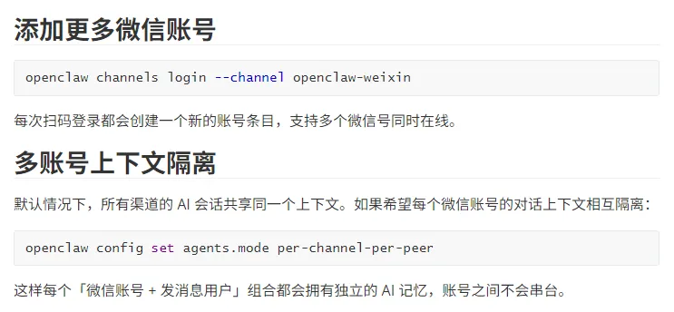 # botid1openclaw channels login --channel openclaw-weixin --account #botid1# botid2openclaw channels login --channel openclaw-weixin --account #botid2