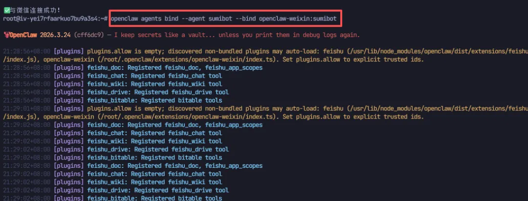 # botid1openclaw agents bind --agent botid1 --bind openclaw-weixin:botid1# botid2openclaw agents bind --agent botid2 --bind openclaw-weixin:botid2