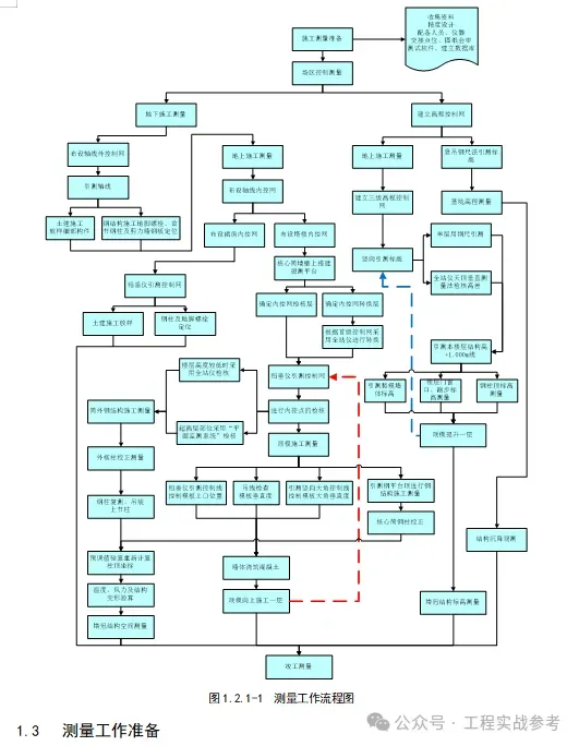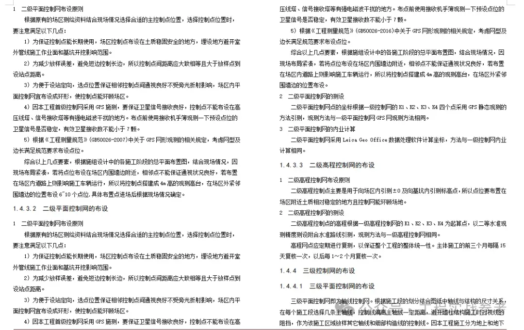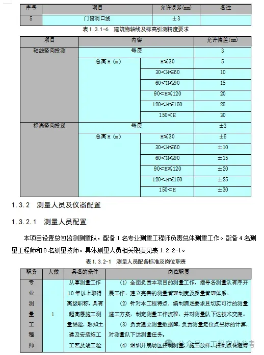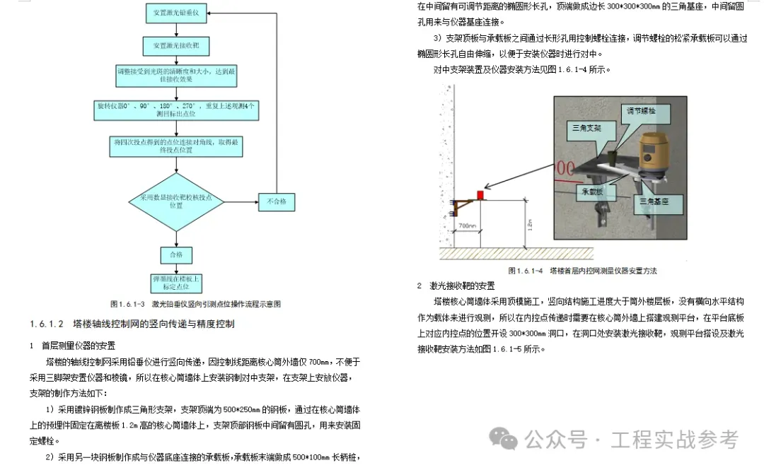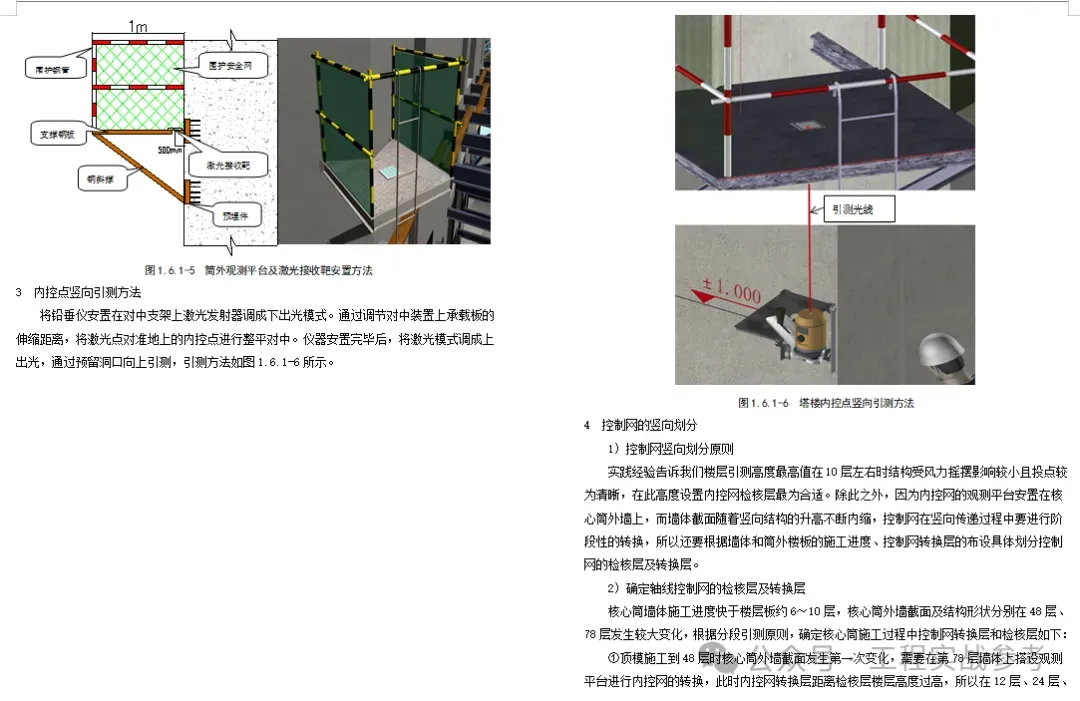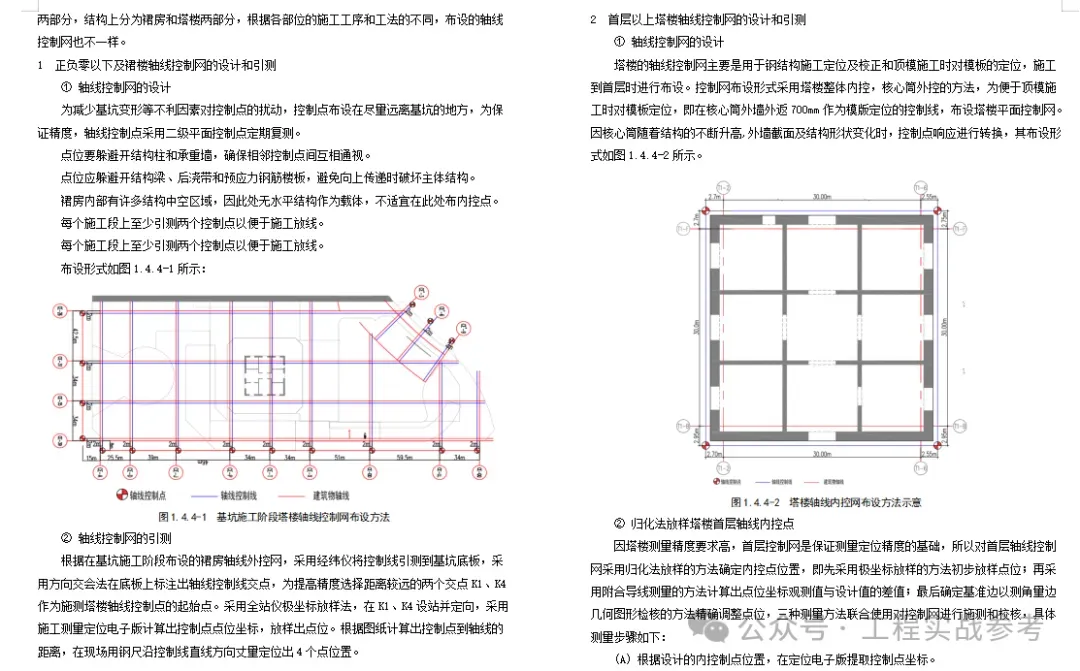 本工程测量工作的主要内容包括:场区控制网的布设;轴线与标高的竖向引测;轴线控制点及高程的检核;核心筒整体平台施工测量;核心筒垂直度测量;结构沉降观测。