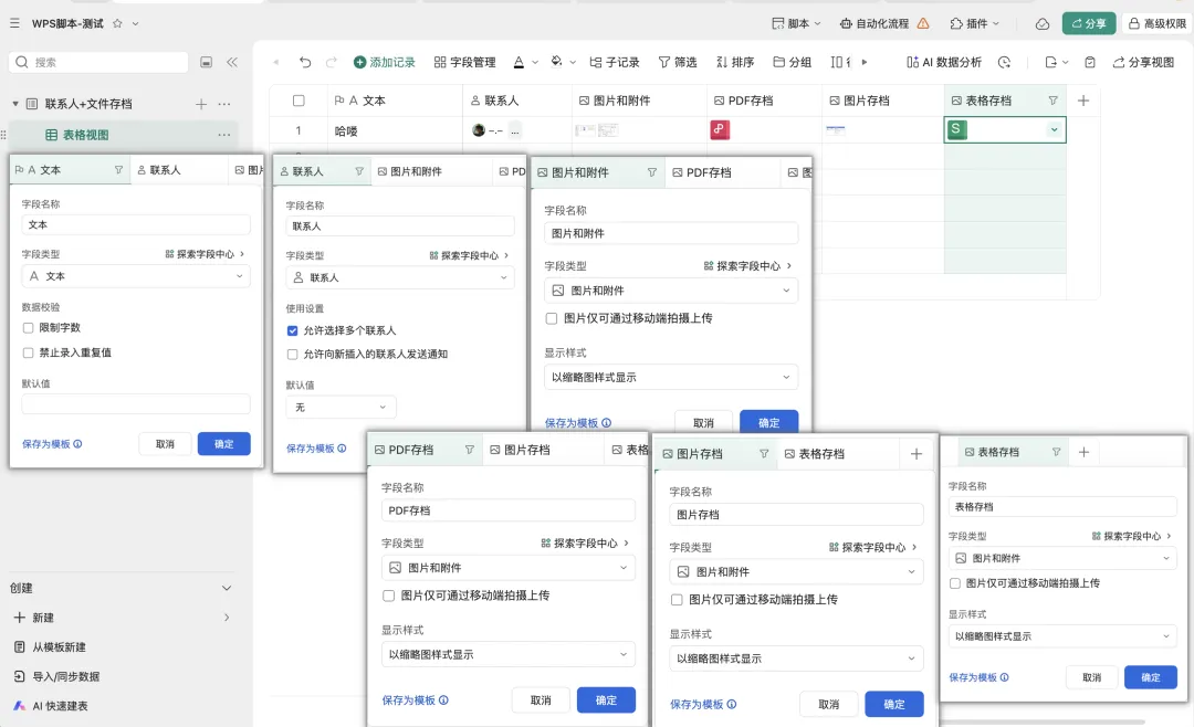这次来个简单点,就文本、联系人、图片和附件3个字段~1、数据表名:联系人+文件存档2、视图名:表格视图3、字段设置:◉ 字段名称:文本– 字段类型:文本 – 限制字数:否- 禁止录入重复值:否 – 默认值:无◉ 字段名称:联系人– 字段类型:联系人 – 使用设置:勾选 允许选择多个联系人,不勾选 允许向新插入的联系人发送通知 – 默认值:无◉ 字段名称:图片和附件 – 字段类型:图片和附件 -显示样式:以缩略图样式显示 – 图片上传方式:无需勾选 仅可通过移动端拍摄上传◉ 字段名称:图片存档 – 字段类型:图片和附件 -显示样式:以列表样式显示 – 图片上传方式:无需勾选 仅可通过移动端拍摄上传◉ 字段名称:PDF存档 – 字段类型:图片和附件 -显示样式:以列表样式显示 – 图片上传方式:无需勾选 仅可通过移动端拍摄上传◉ 字段名称:表格存档 – 字段类型:图片和附件 -显示样式:以列表样式显示 – 图片上传方式:无需勾选 仅可通过移动端拍摄上传