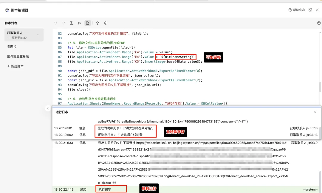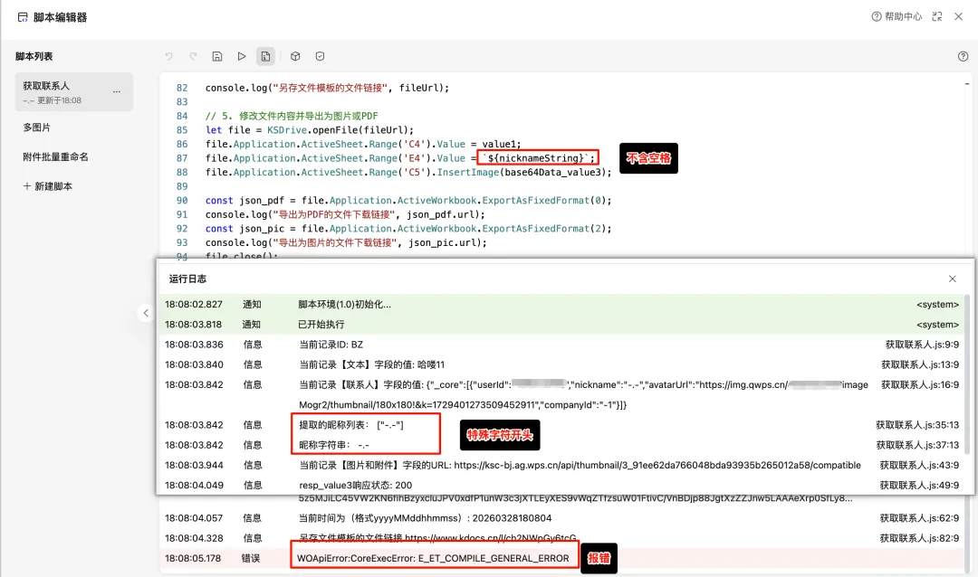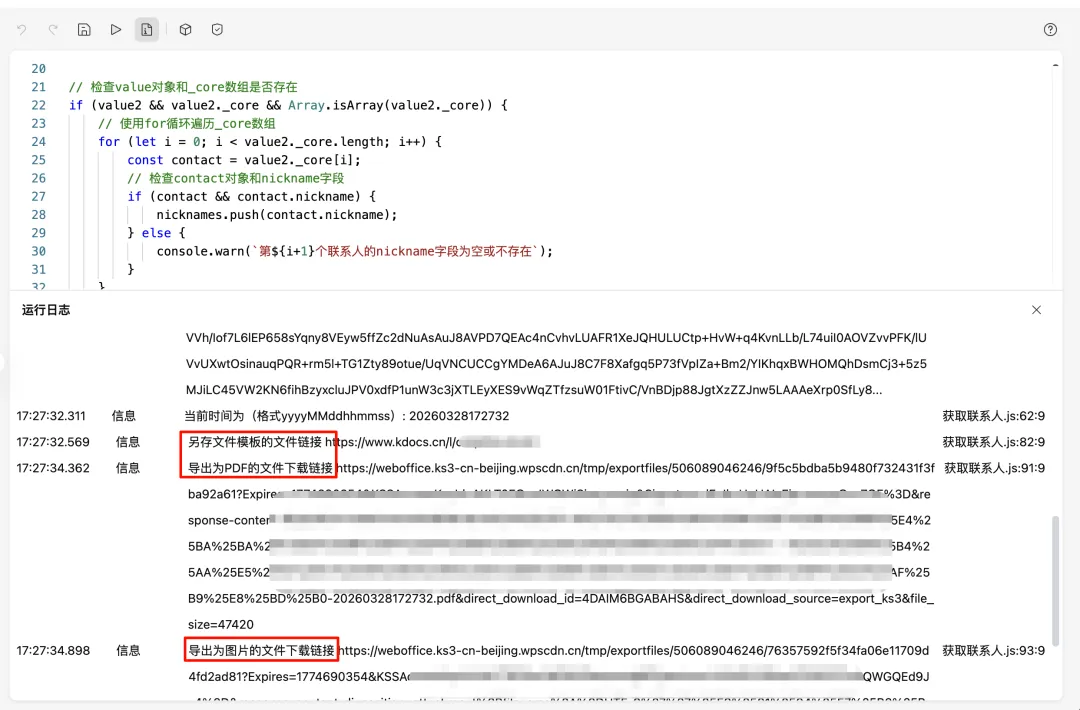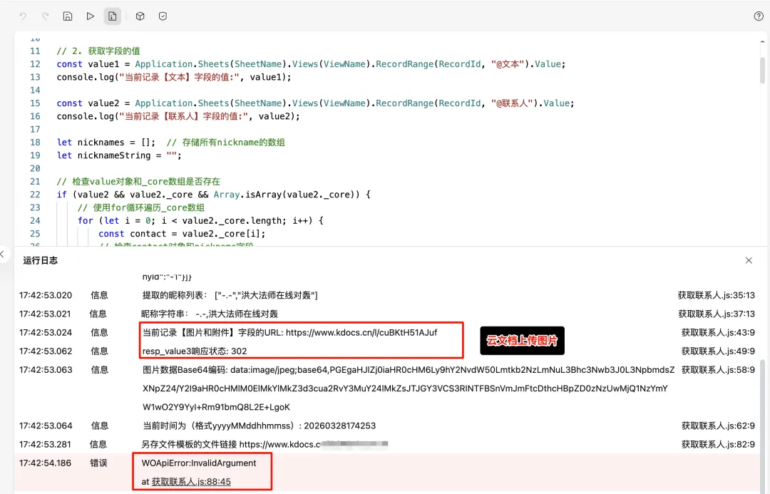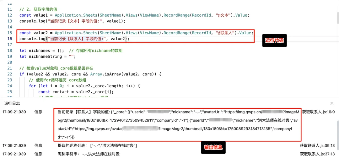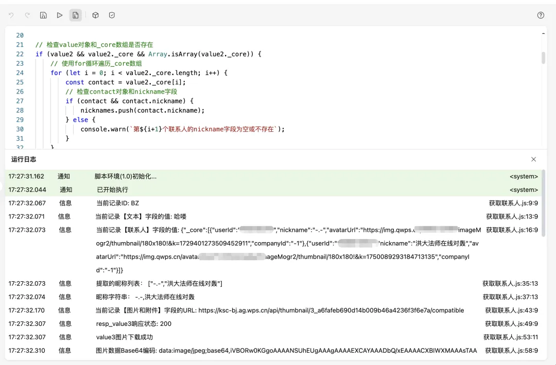 const value2 = Application.Sheets(SheetName).Views(ViewName).RecordRange(RecordId, "@联系人").Value;console.log("当前记录【联系人】字段的值:", value2);let nicknames = []; // 存储所有nickname的数组let nicknameString = "";// 检查value对象和_core数组是否存在if (value2 && value2._core && Array.isArray(value2._core)) {// 使用for循环遍历_core数组for (let i = 0; i < value2._core.length; i++) {const contact = value2._core[i];// 检查contact对象和nickname字段if (contact && contact.nickname) {nicknames.push(contact.nickname);} else {console.warn(`第${i+1}个联系人的nickname字段为空或不存在`);}}// 输出结果console.log("提取的昵称列表:", nicknames);nicknameString = nicknames.join(",");console.log("昵称字符串:", nicknameString);} else {console.error("联系人数据格式异常,无法提取nickname");}