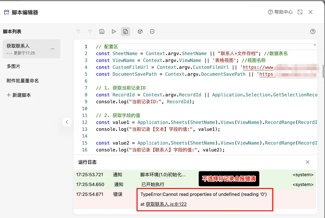如果想要直接运行脚本,需要先选择某一行记录哦因为脚本内容不是批量处理所有记录的,所以不指定行记录,脚本是不知道要处理的是哪一行,结果自然而然就是报错啦