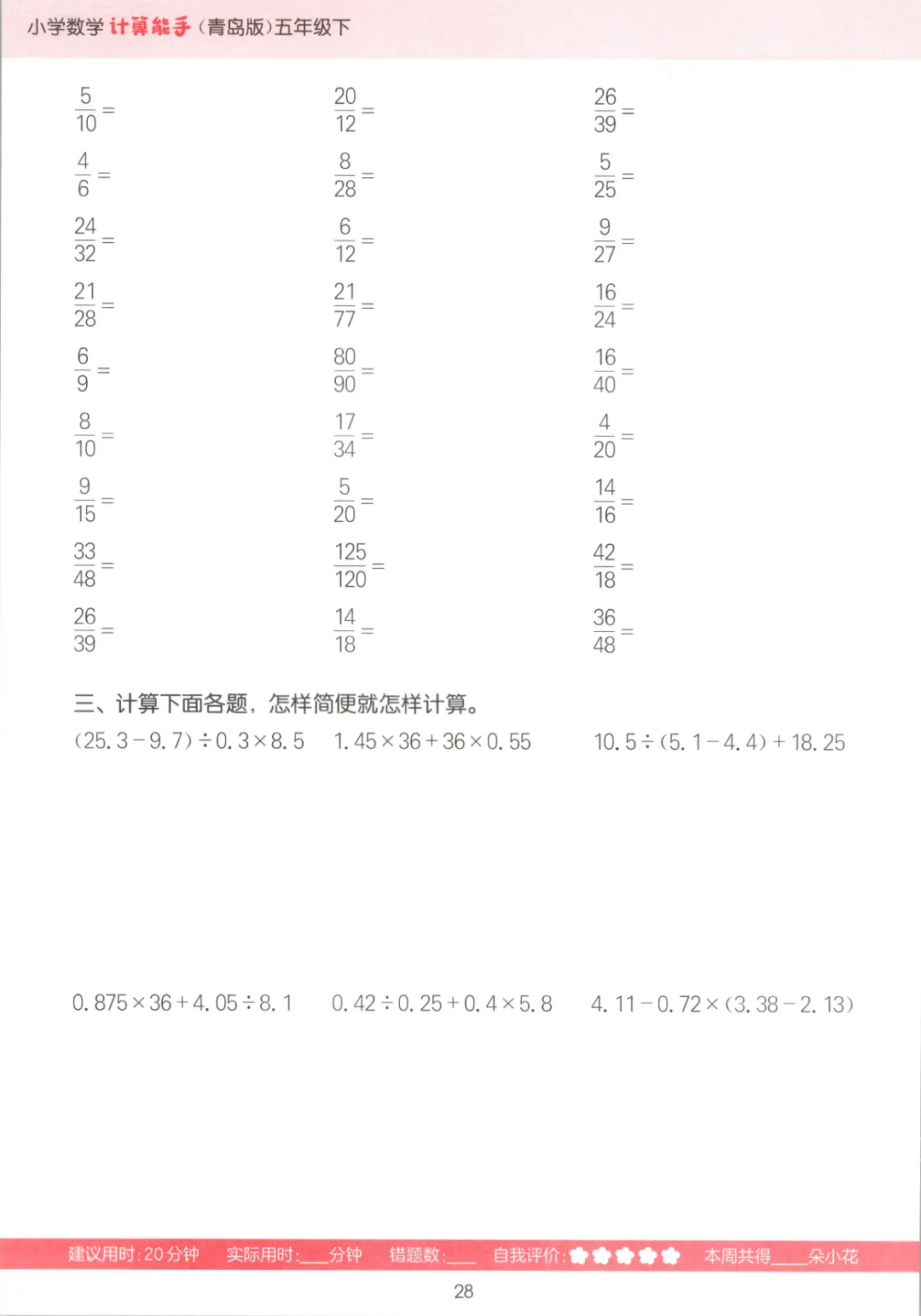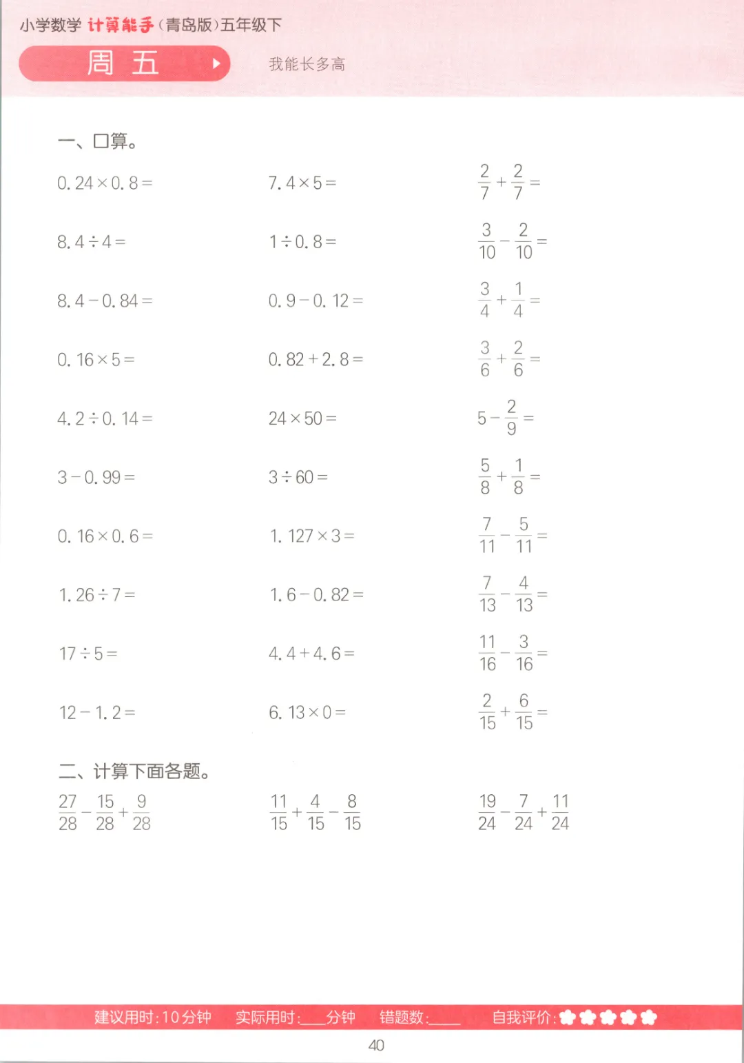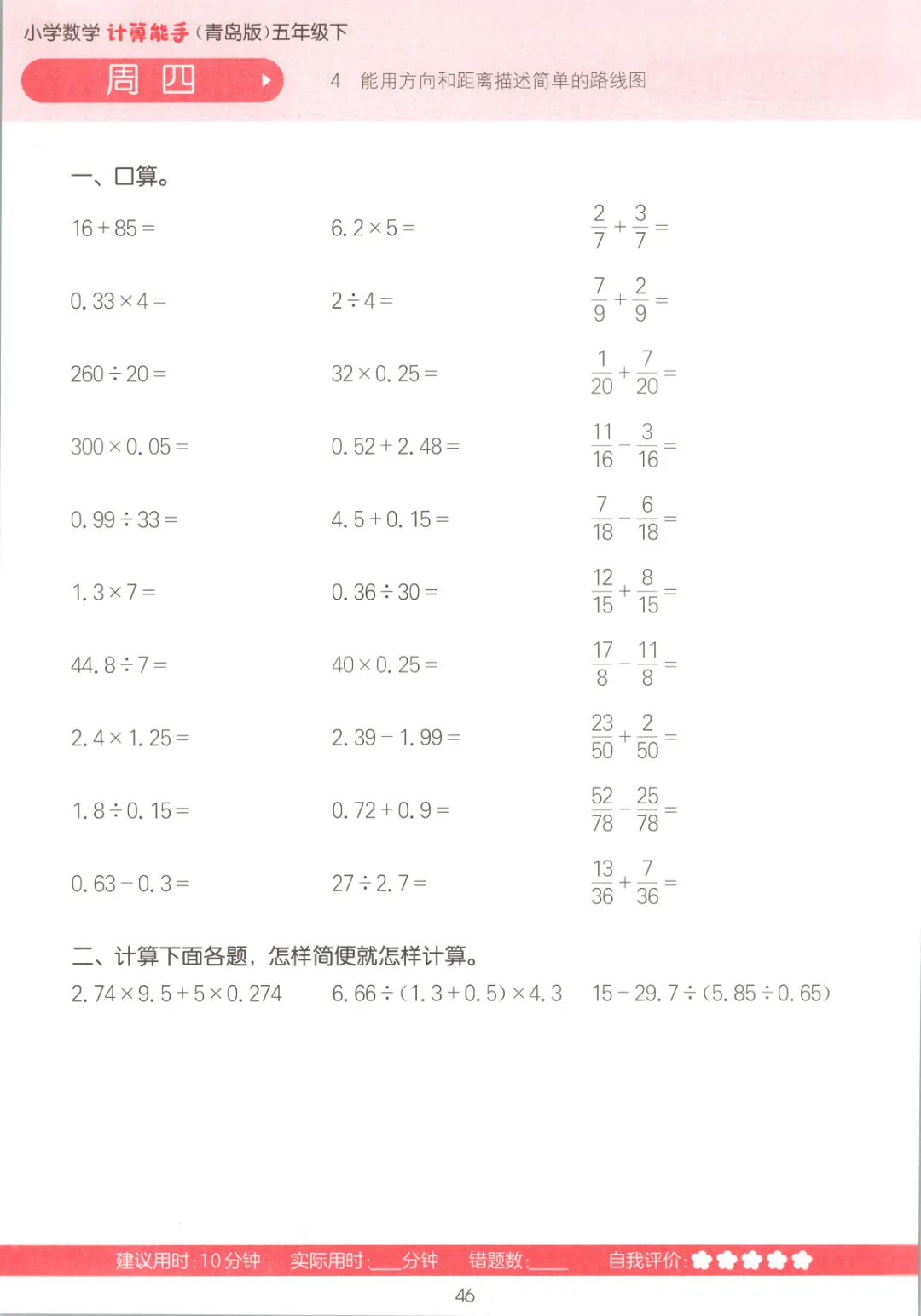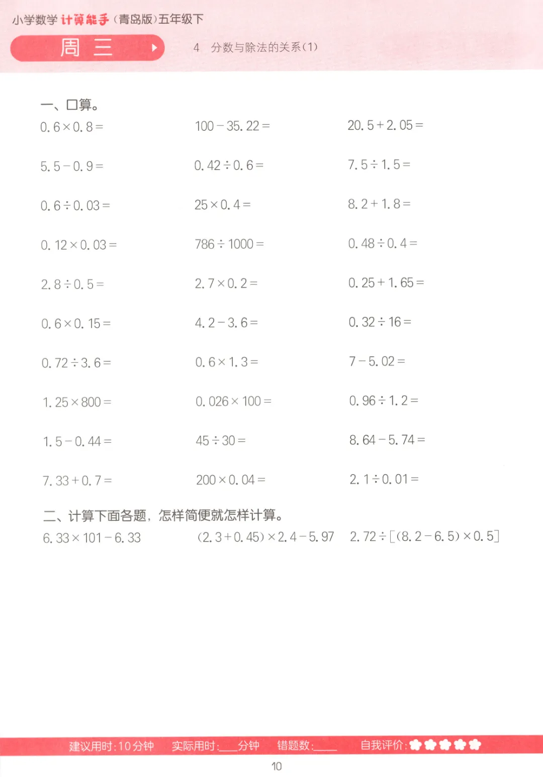 2026春1-6年级下册青岛63版数学《口算计算天天练》口算竖式脱式计算,含答案高清可打印