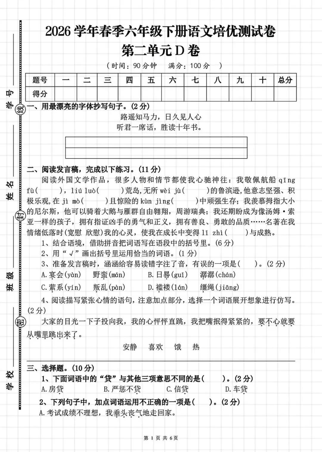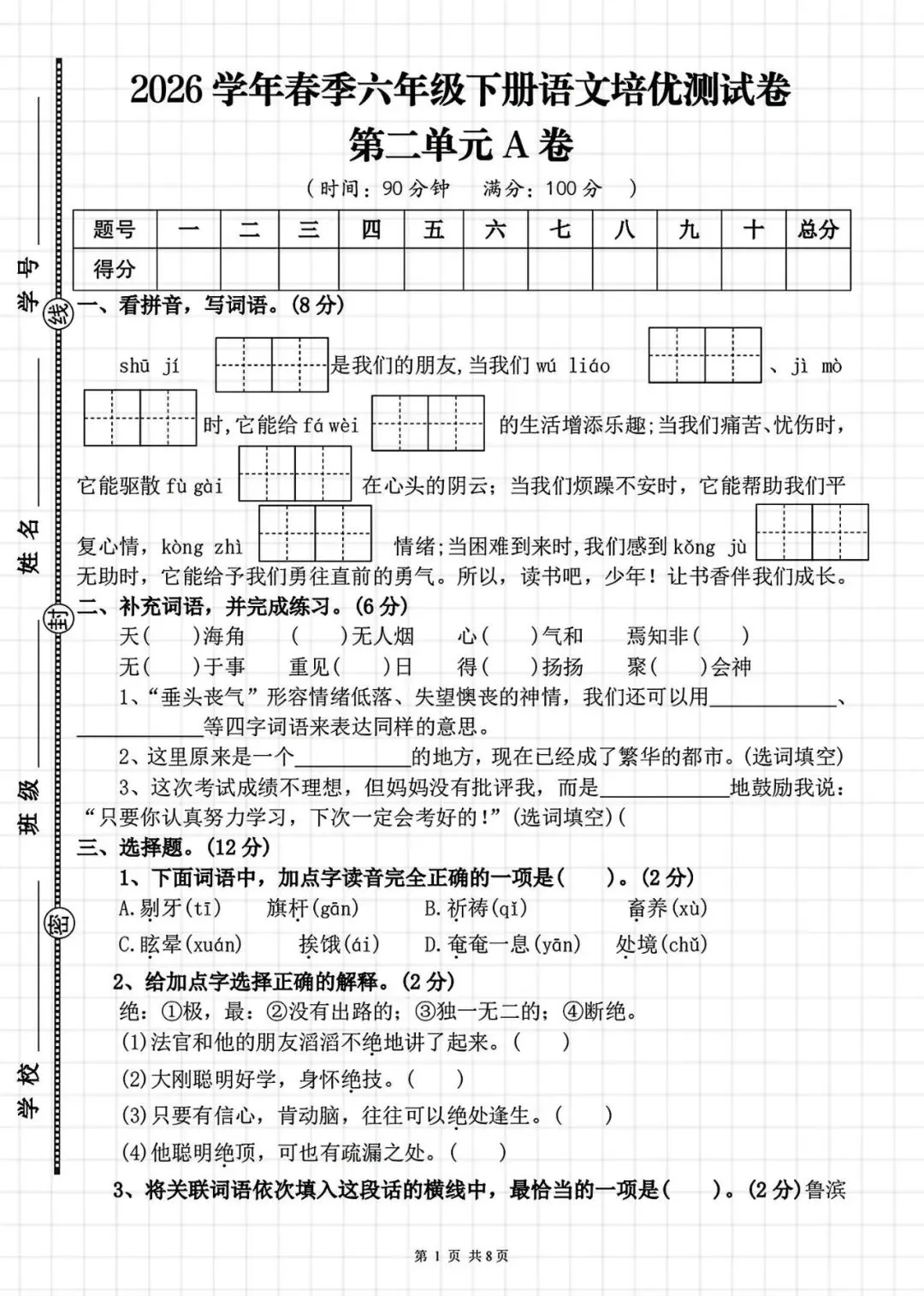 大家好,我是蒂尼江,今天分享的是2026春六年级下册人教部编版语文《第二单元情景卷》,关注我,每天持续分享更多的优质学习资料。
