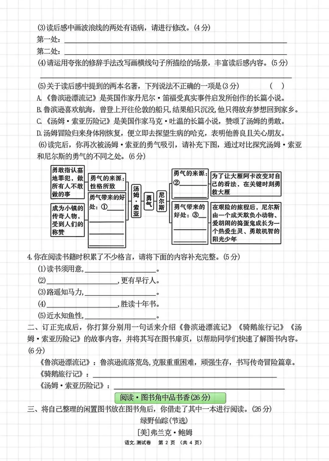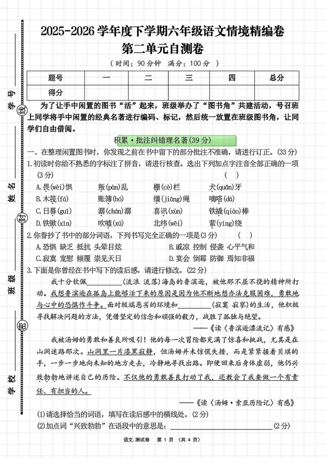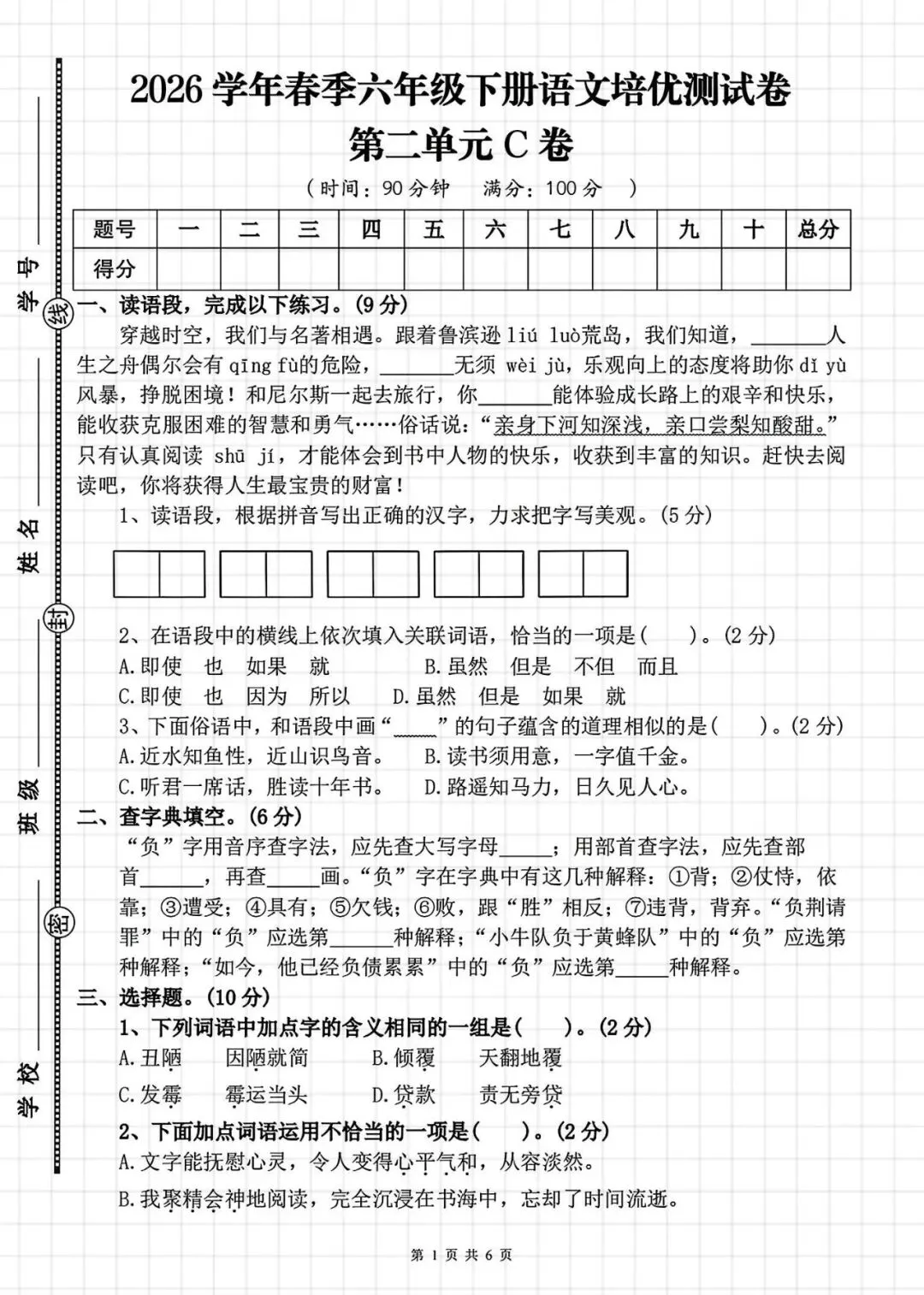 2026春六年级下册人教部编版语文《第二单元情景卷》(有答案 ),可打印