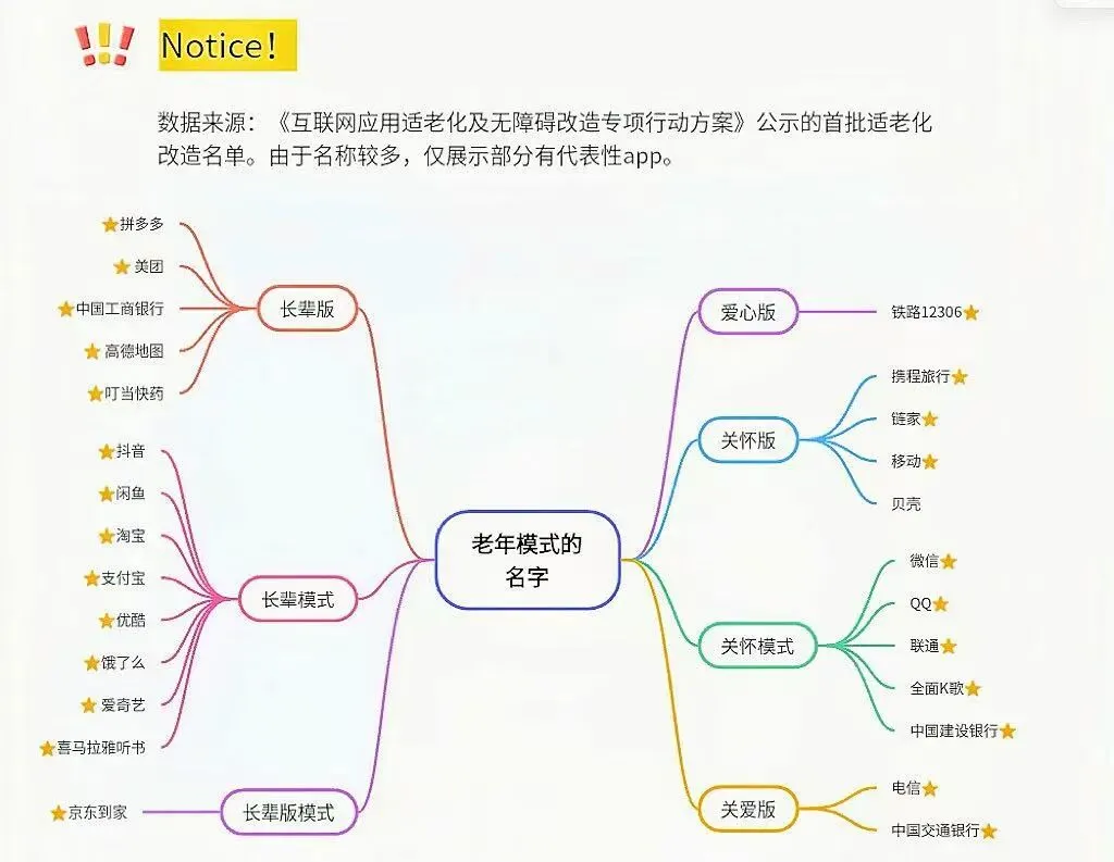 想用上适老功能,第一步往往就难倒了长辈。不同App的老年模式名称五花八门:有的叫“长辈版”,有的叫“关怀模式”,还有的取名“爱心版”,光记名字就够费神。以下是我粗略的查找了以下目前市面上一些软件的老年模式名称: