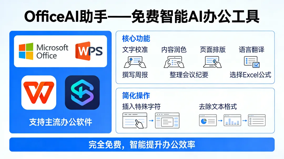 OfficeAI助手是免费的Microsoft Office和WPS智能AI办公工具,帮助用户快速完成繁琐任务。比如文字校准、内容润色、页面排版、语言翻译、撰写周报、整理会议纪要、选择Excel公式等。OfficeAI助手简化复杂的操作,例如插入特殊字符或去除文本格式等。