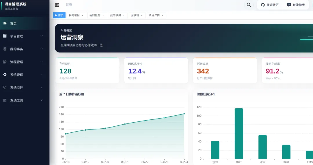我们基于 Spring Cloud & Spring Cloud Alibaba 打造了一套项目流式管控平台,集成主流技术栈,覆盖认证、流程、任务、监控等全流程,助力企业实现项目管理的流程化、自动化、可视化!💡