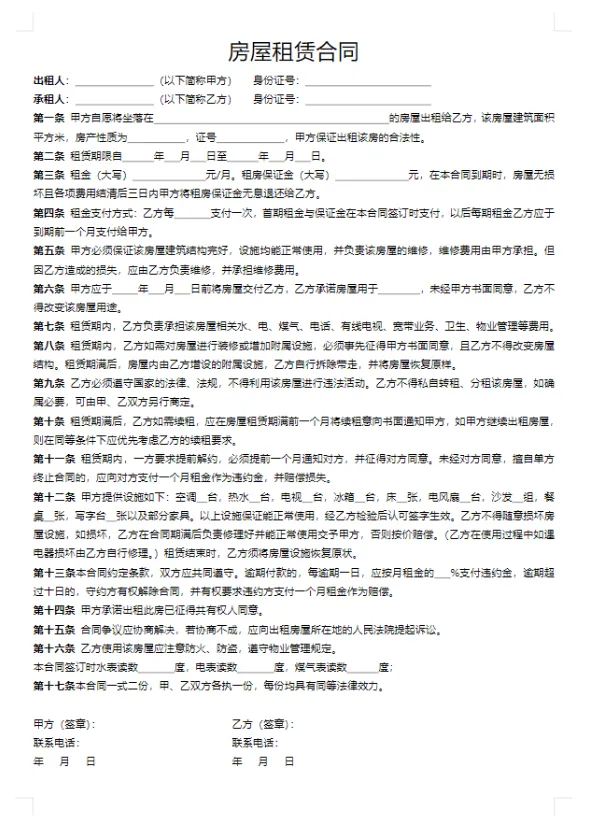 房屋租赁合同模板word电子版可打印免费下载【直接保存使用】