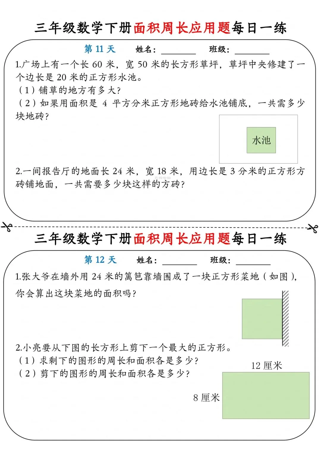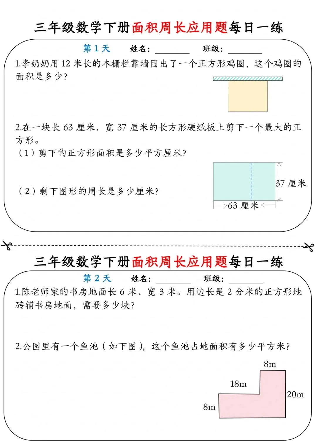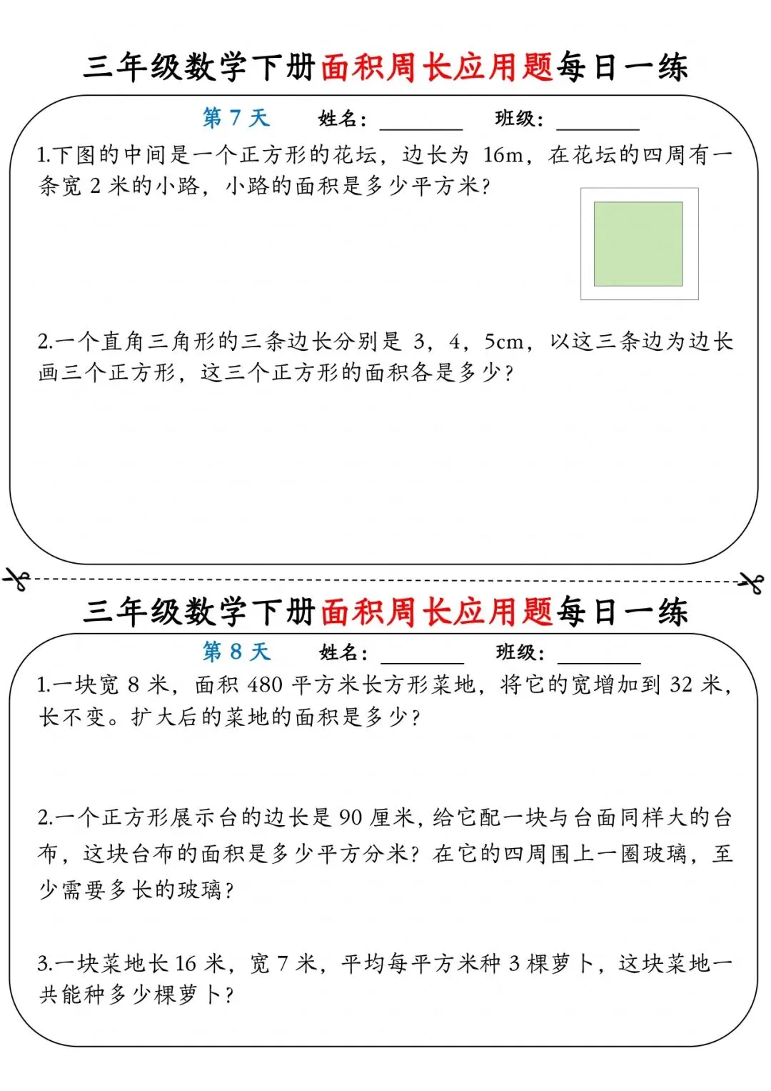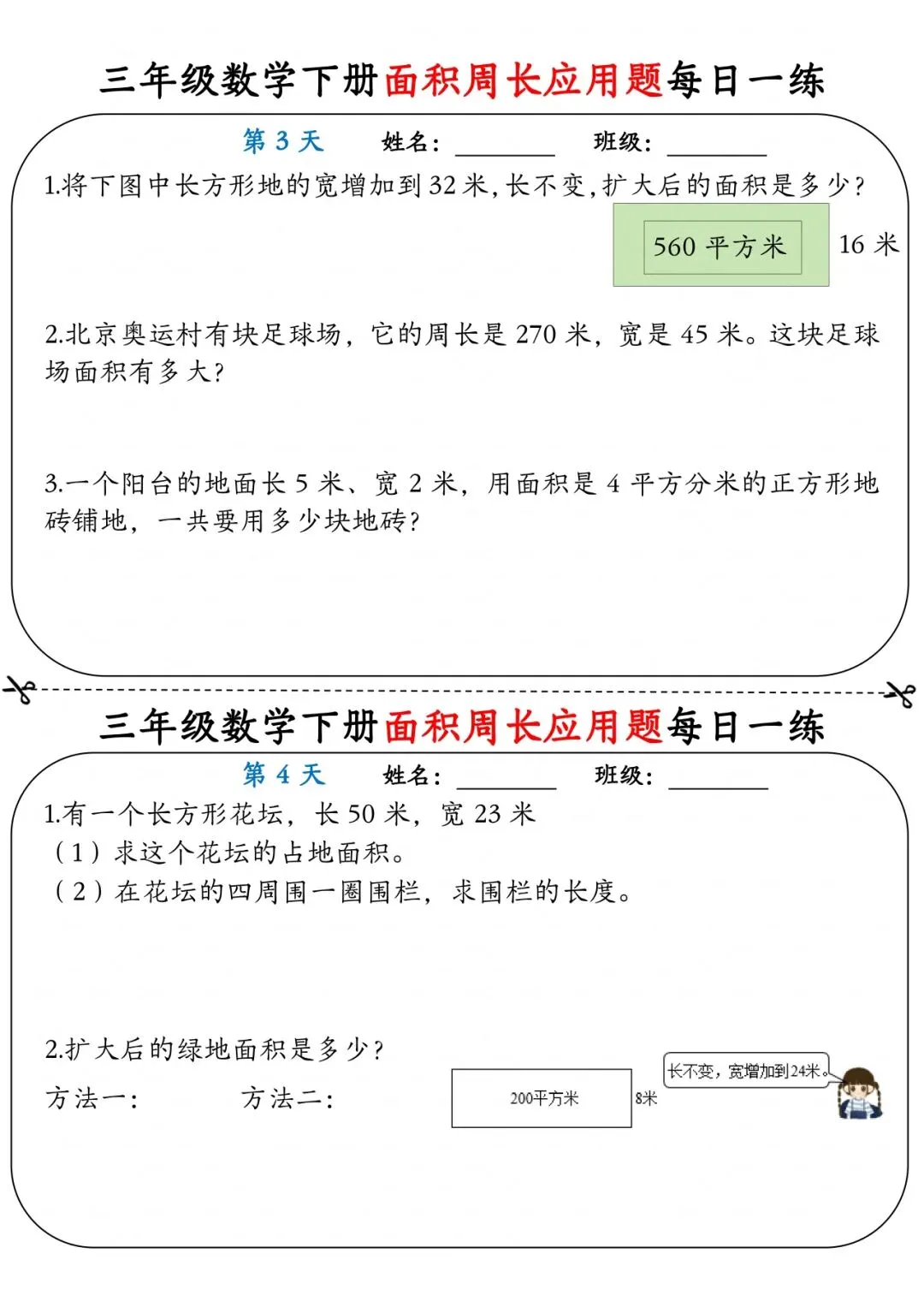 今日分享:三年级下册数学重难点来了!周长和面积总是混淆、应用题一做就错?这份《面积周长应用题每日一练》帮孩子专项突破,每天练一练,分清公式、理清思路,攻克几何应用题,数学稳步提升,家长快收藏打印!