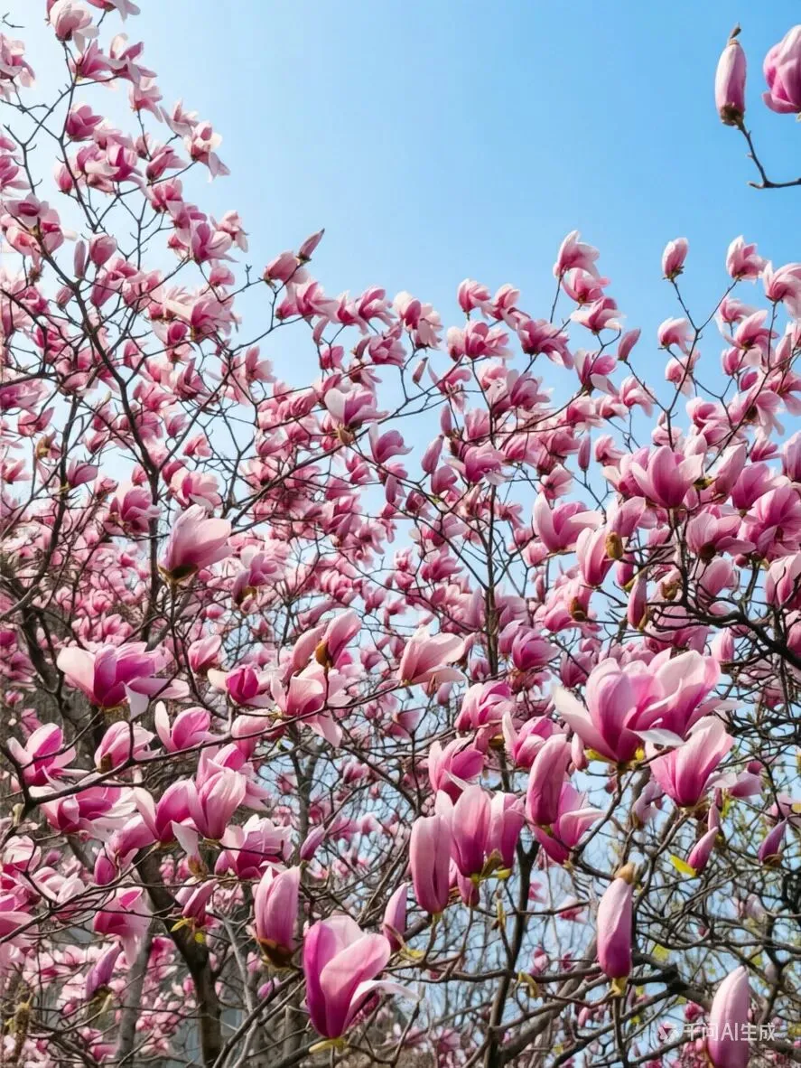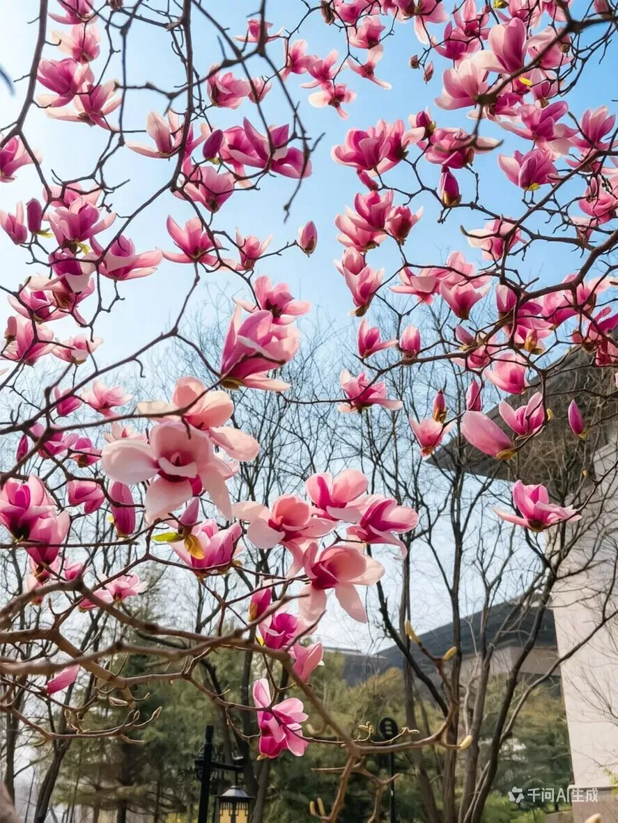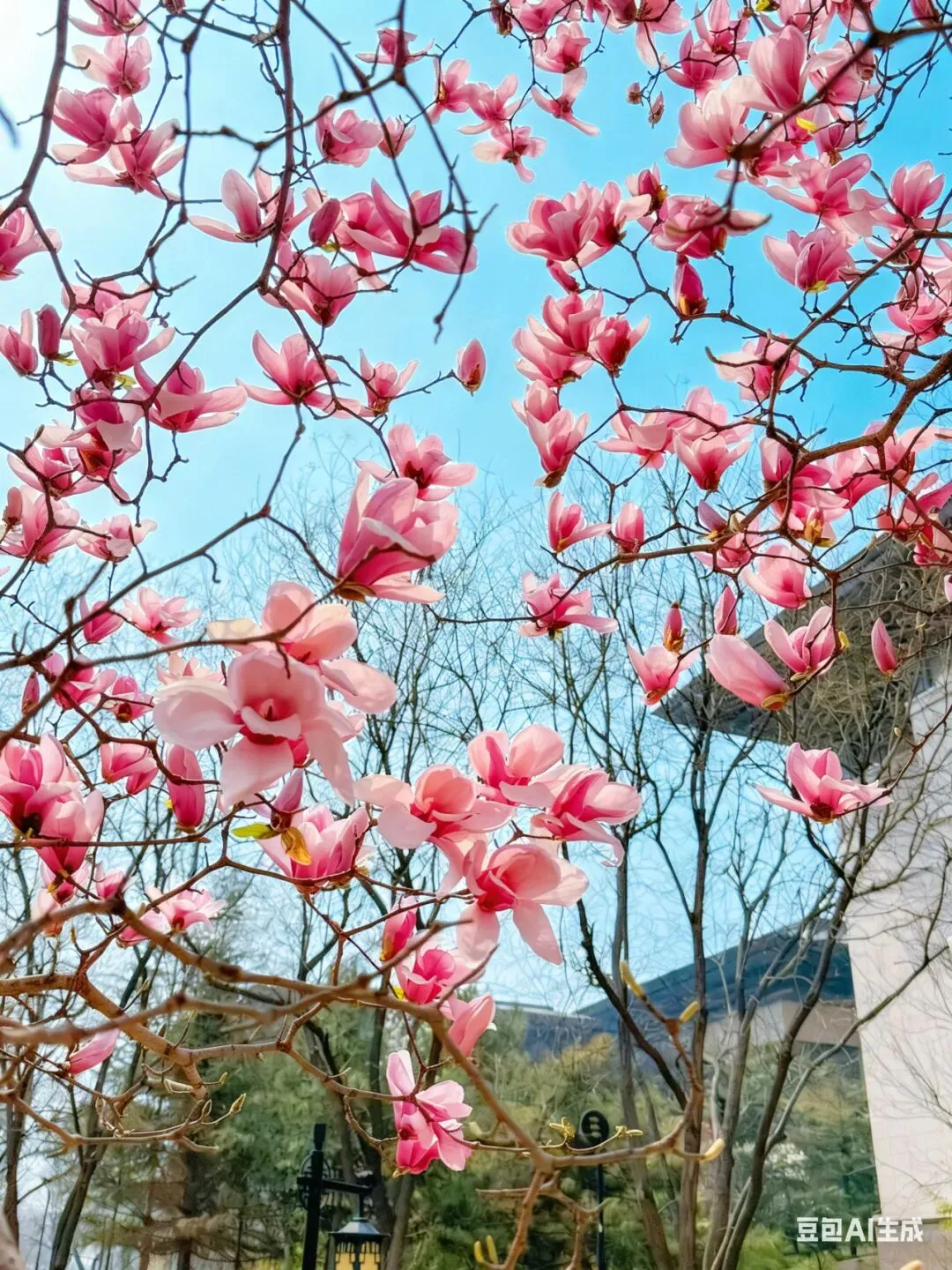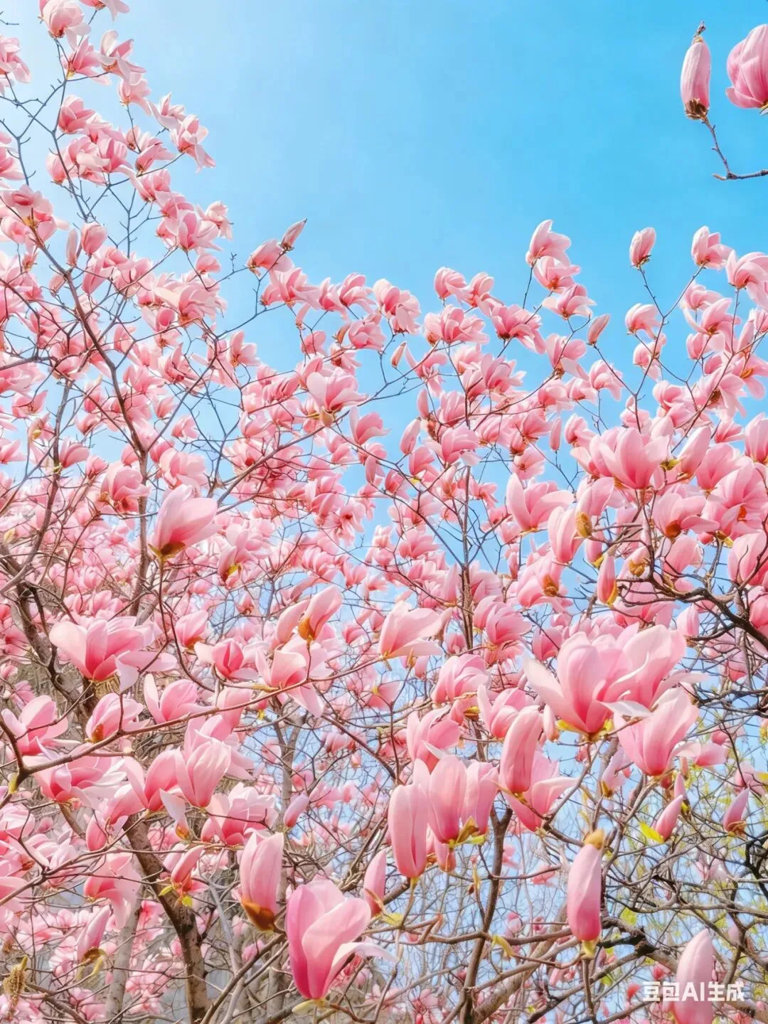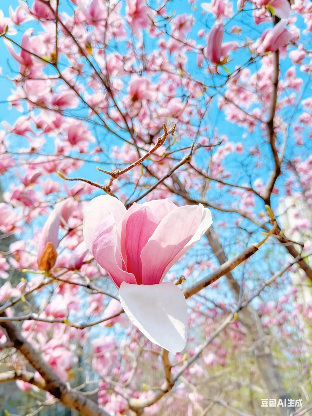 “修一下这张图片,让画面变得通透,柔和、清新、自然。玉兰花的颜色更加的鲜艳突出,天空更蓝。”