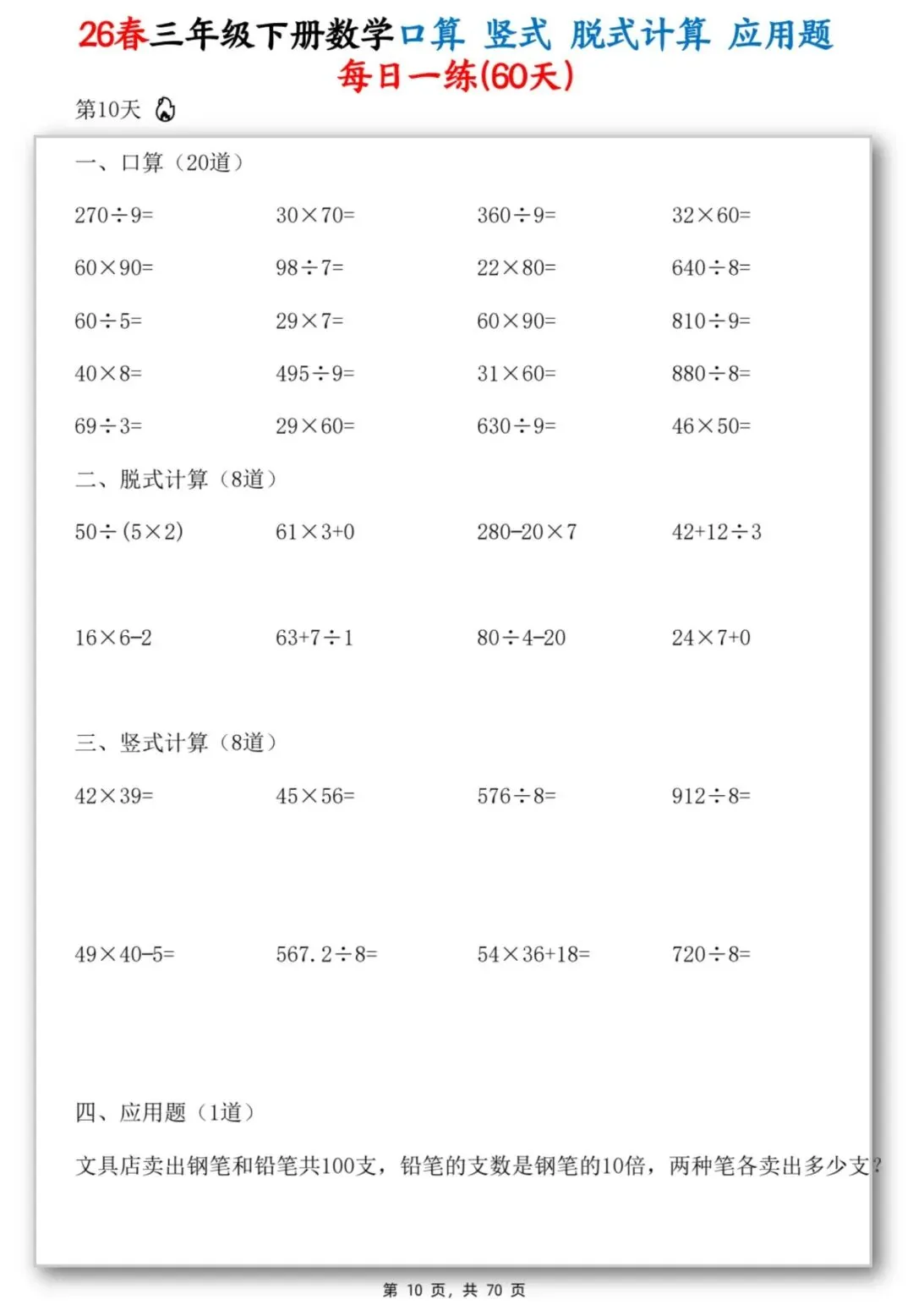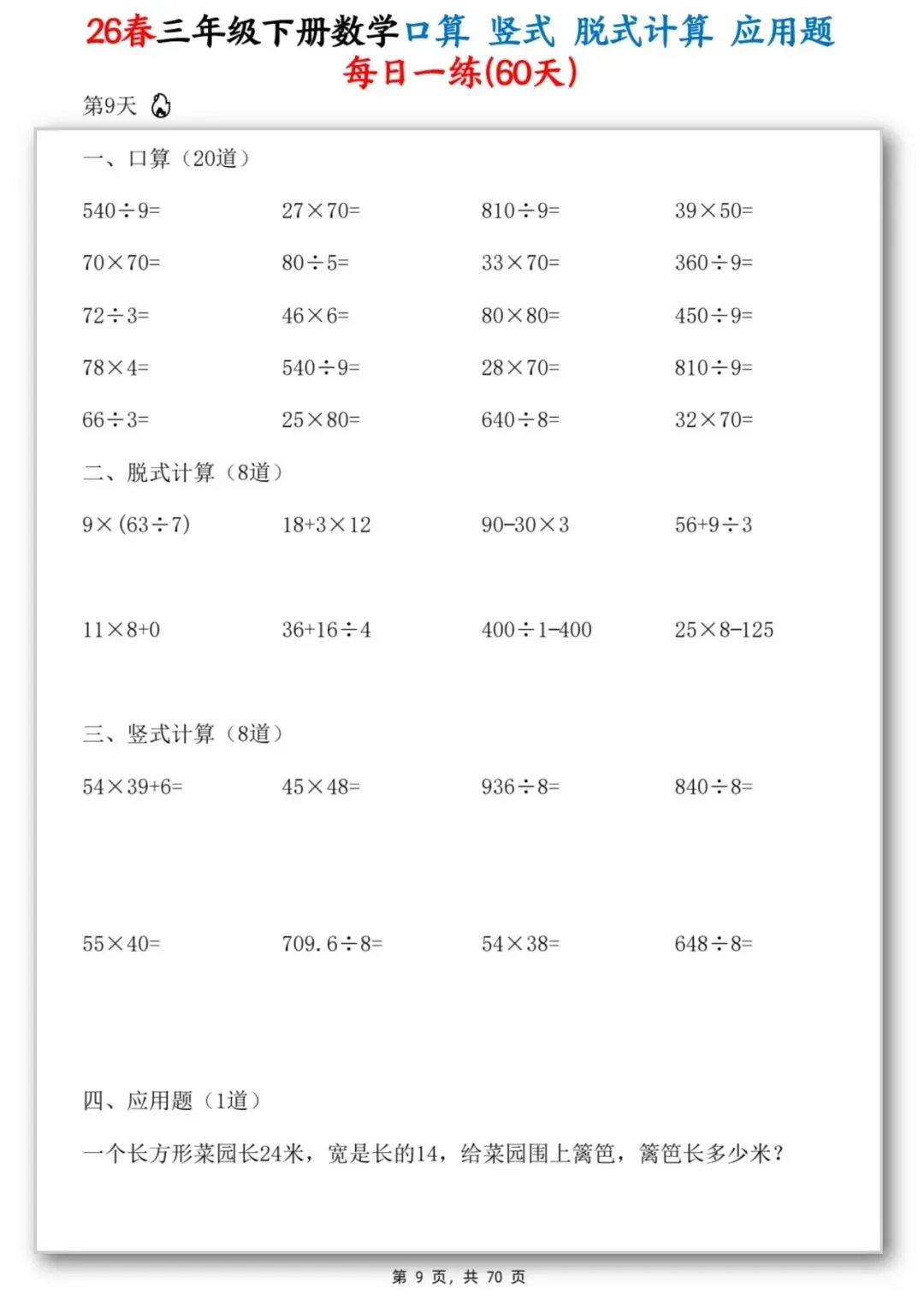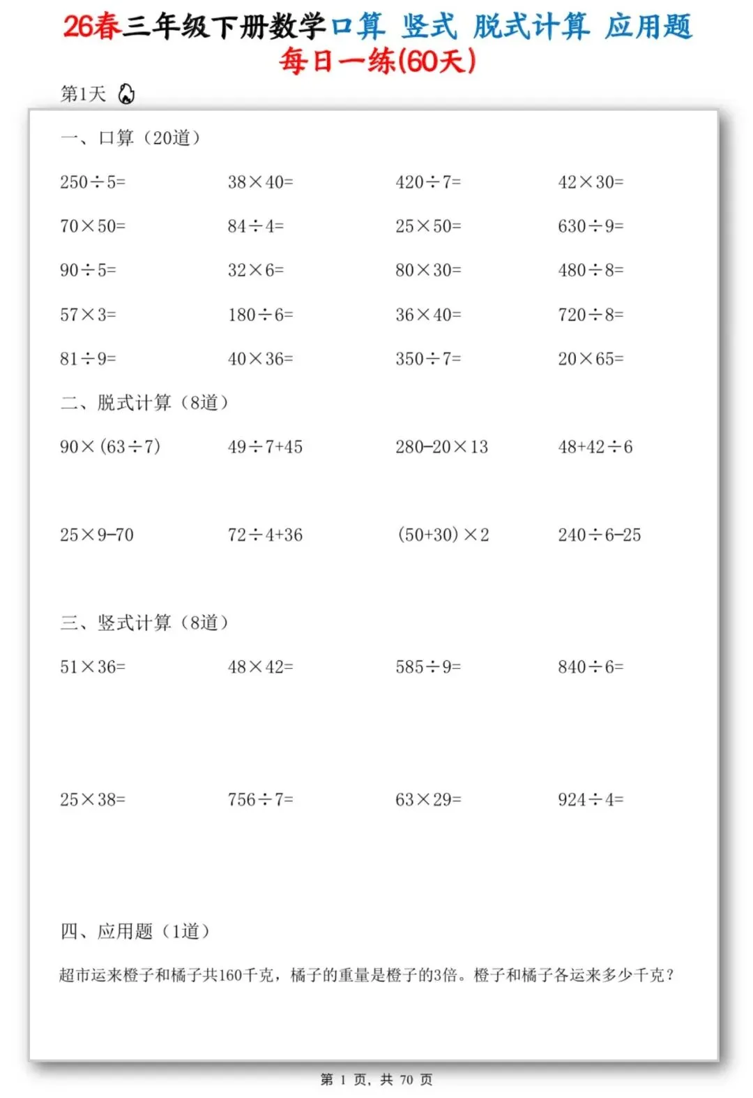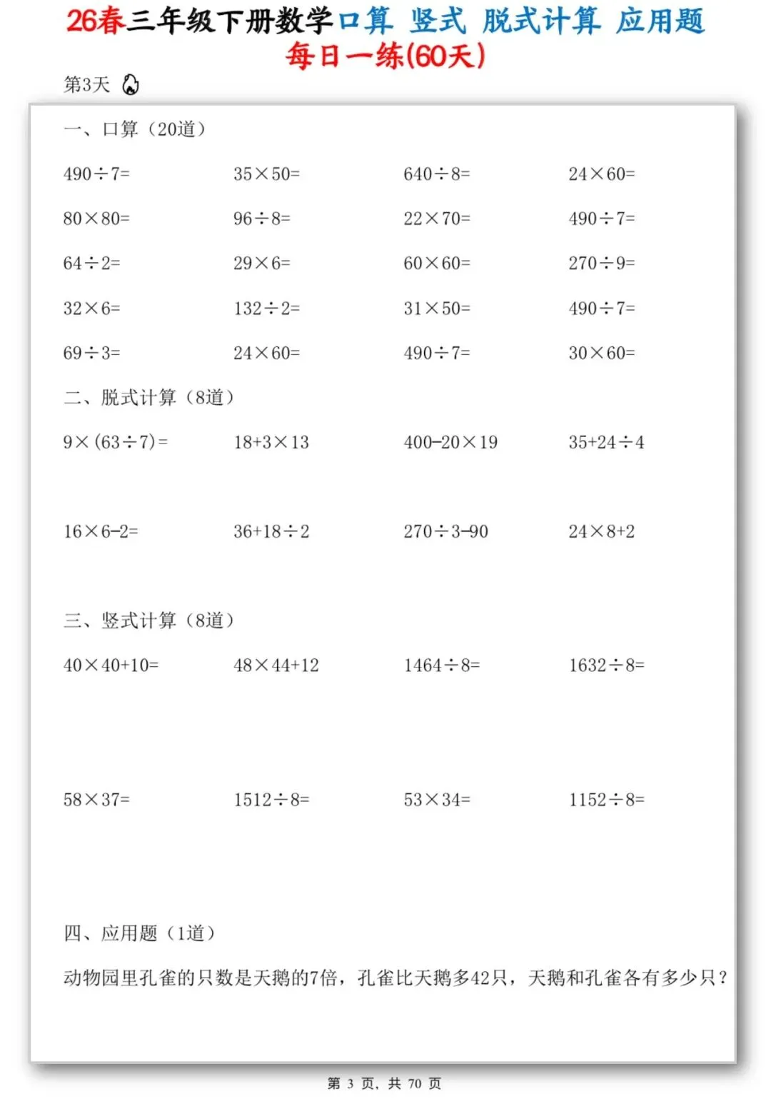 26春季最新版三年级下册数学【应用题】竖式、脱式计算、口算、共70页,可打印