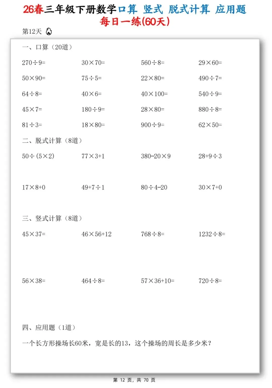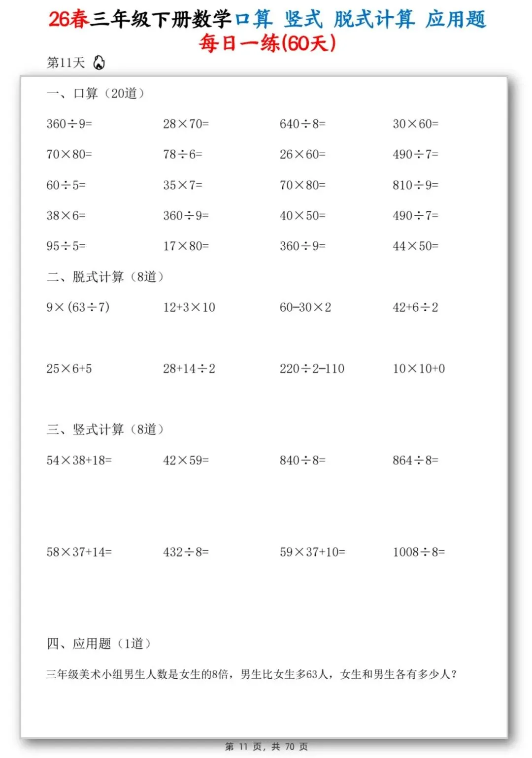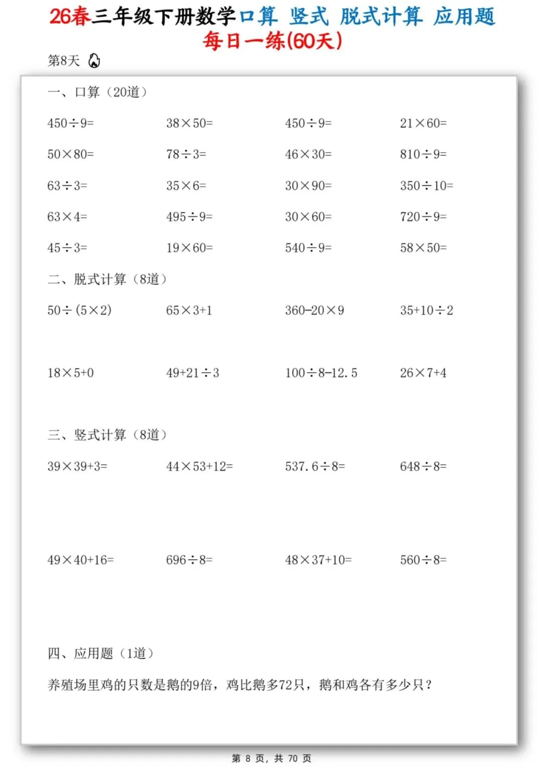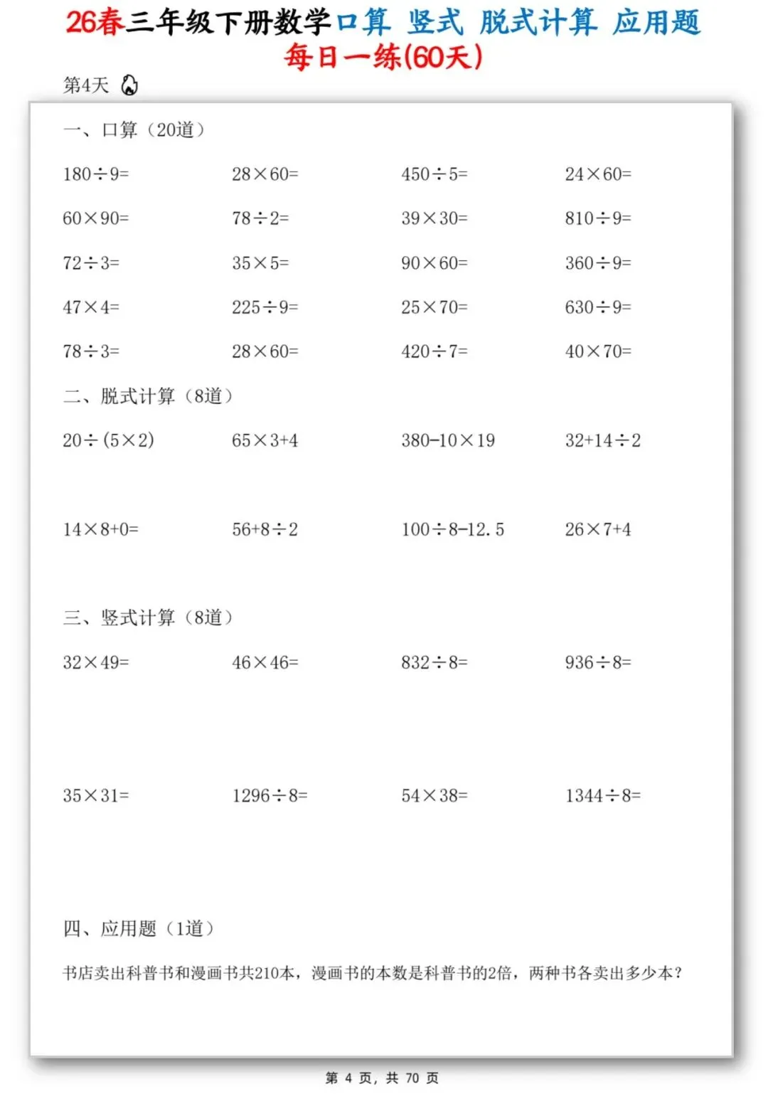 26春季最新版三年级下册数学【应用题】竖式、脱式计算、口算、共70页,可打印