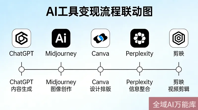 这5款工具,每一款都有明确的变现用途,重点联动前2款(ChatGPT+Midjourney),后面3款作为辅助,新手不用全部精通,会用核心2款+辅助1款,就能开始变现。