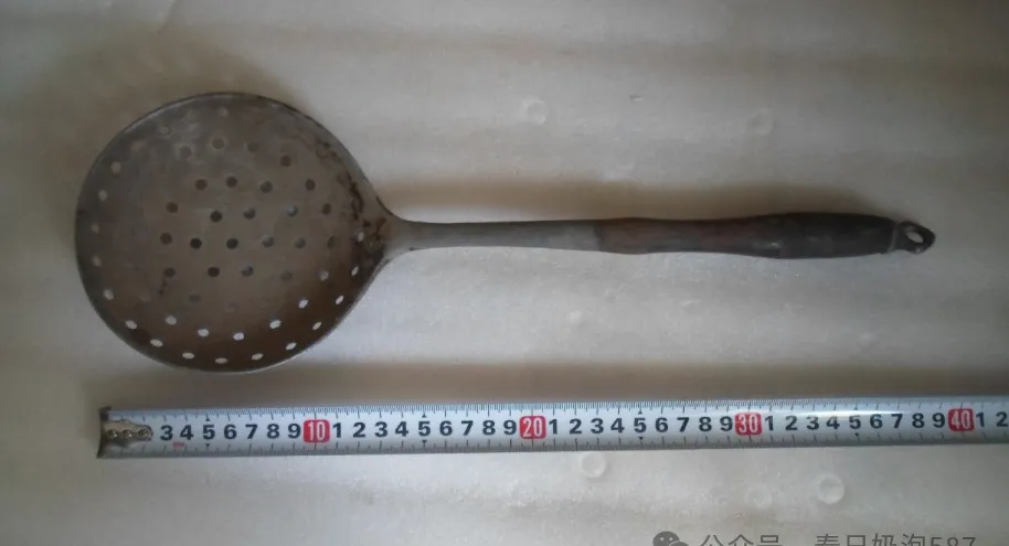 锅上捞面的铁漏勺,圆头细洞,铁柄早被用得乌黑,奶奶煮饺子、泡菜全靠它,捞出来全是锅底的烟火气,现在换上不锈钢、硅胶,手里没那劲道。