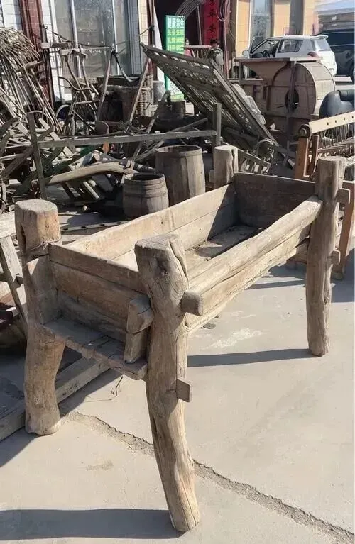 粗看像张矮床,其实是牲口吃料的木槽,大早上牛一闻味就凑过来哞一声,木头边上抹得光滑发亮,喂料动作像一套仪式,现在养牛少了,木槽留着多半只剩下做花槽的命了。