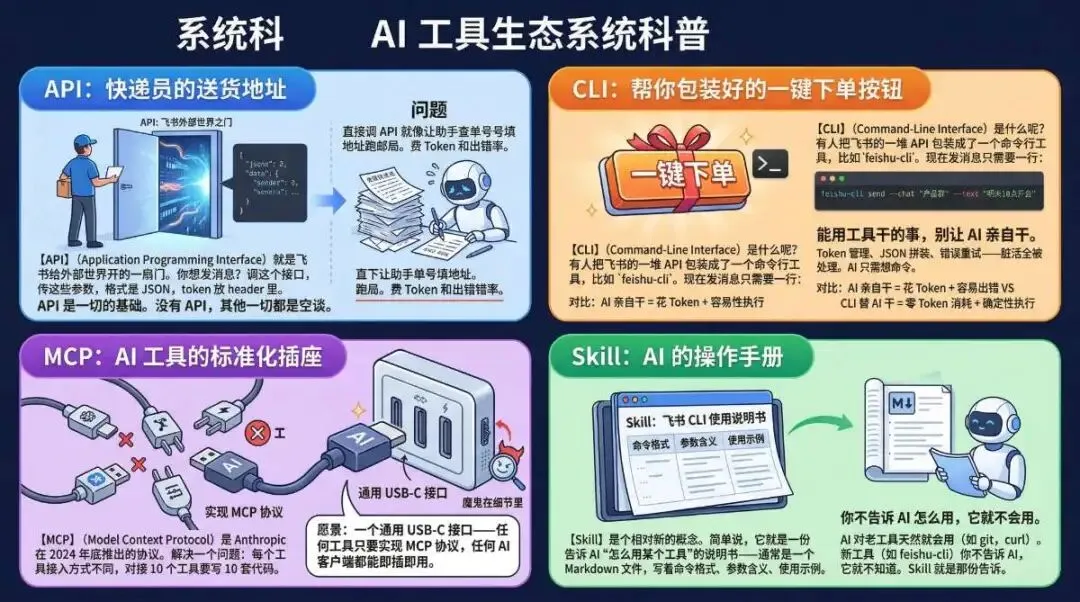 feishu-cli不是 git,AI 训练的时候根本没见过它。AI 怎么知道要去运行feishu-cli --help?它连这个工具叫什么名字都不知道啊!”这就是 Skill 登场的时刻。