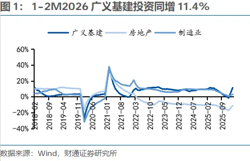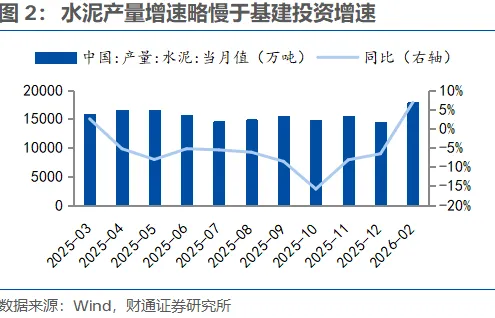 固投增速止跌回稳,建筑安装工程是增速回暖的主要驱动力。1-2M2026全国固定资产投资完成额5.27万亿元,同比+1.8%。其中,广义基建、房地产、制造业分别同比+11.4%/-11.1%/+3.1%。从实际工作量水平来看,1-2月水泥产量1.78亿吨同比+6.8%,水泥出货量有所回暖,符合固投的总体变化趋势。另外从统计局公布的分项数据看,26M1-2固投中建安工程/设备购置/其他费用分别同比+0.6%/+11.5%/-1.9%,增速较25M1-12提高9/-0.3/+0.4pct,可以看出,前两月固投增速回暖的主要驱动力是建安工程。