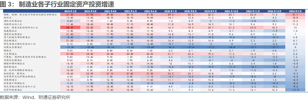 1-2月的固投数据一定程度上印证了钢结构需求向上。2026年1—2月份,制造业投资同比+3.1%,增速比2025年全年+2.5pct。子行业中,前两月较去年全年增速明显改善的主要有运输设备制造、纺织、造纸、农副、燃料加工、金属制品、通用设备、电气机械、食品制造、专用设备等领域,景气明显回落的主要是仪器仪表、高技术制造、电子设备制造、化工、家具、非金属矿业等。我们认为如化工、建材、钢铁等重工业本身对轻钢结构厂房的需求量偏小,而设备制造、电池、新能源等领域对轻钢结构厂房的需求相对更高。因此,如果从子行业的角度看,制造业分项的增速分化对钢结构需求较为有利。结合分科目和分行业的投资增速,我们认为有一种情景是可能存在的:1)基建的高增长对建筑安装工程投资的增长产生了贡献;2)制造业景气改善的子行业中,改善的部分原因是这些子行业的建筑安装工程实现了较高增长(因为全行业的设备购置投资增速前两个月没有提升)。若这样的情景成立,钢结构需求端的逻辑则进一步得到证实。