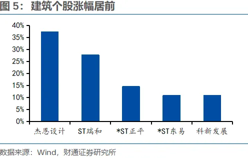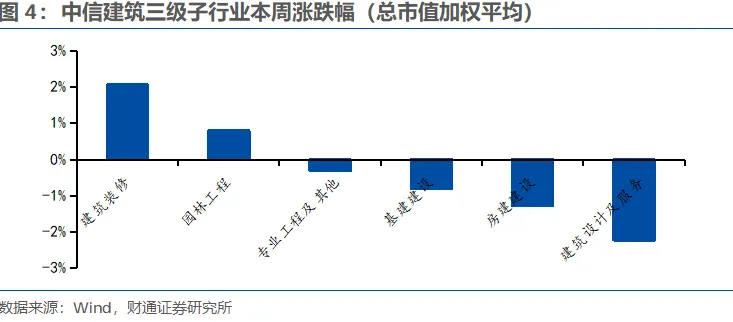 本周建筑指数下跌0.83%,沪深 300 板块下跌1.41%,建筑板块跑赢大盘0.58pct。根据总市值加权平均统计,装修、园林板块涨幅靠前,个股中涨幅较为靠前的有杰恩设计(+31%)、*ST瑞和(+28%)、*ST正平(+14%)、*ST东易(+11%)、科新发展(+11%)。