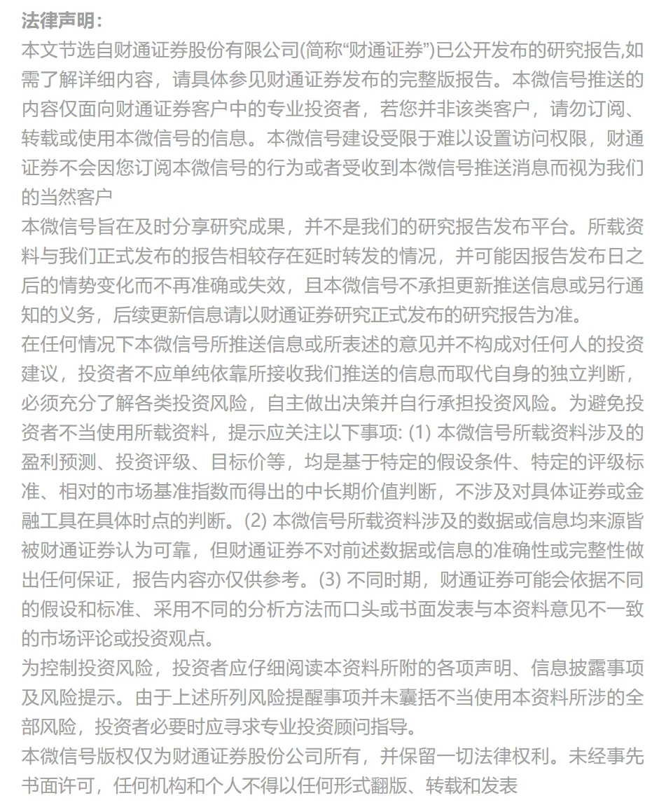 本微信号推送的内容仅面向财通证券客户中符合《证券期货投资者适当性管理办法》规定的专业投资者。本微信号建设受限于难以设置访问权限,为避免不当使用所载内容可能带来的风险,若您并非专业投资者,请勿订阅、转载或使用本微信号的信息。