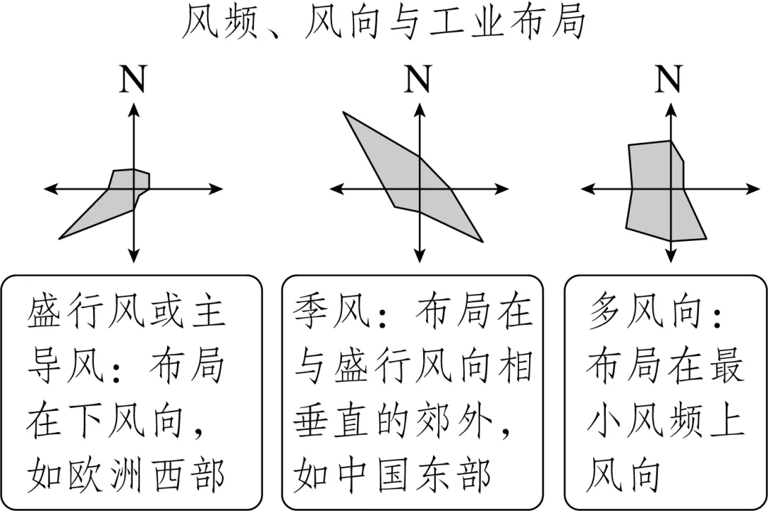 (2)“水”:有水污染的工业应布局在河流下游;对水质要求高的工业应布局在河流上游;运输量大的工业可利用水运条件。