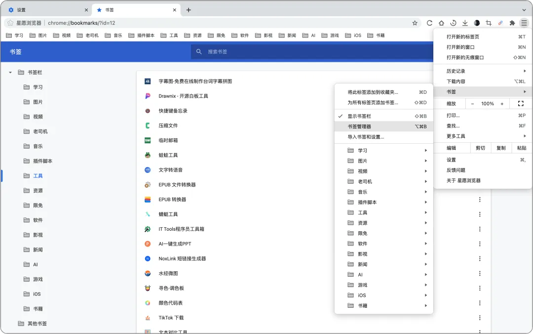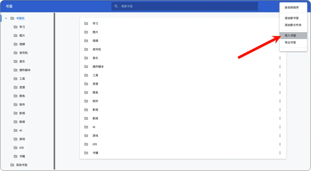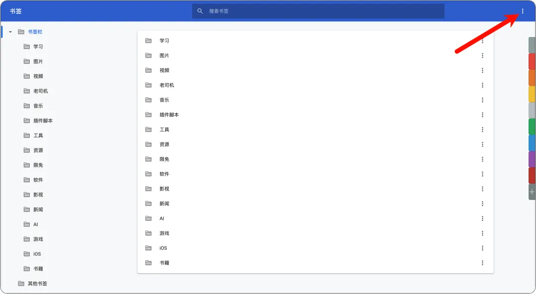 进入 书签管理器 → 点击右上角 “三个点”