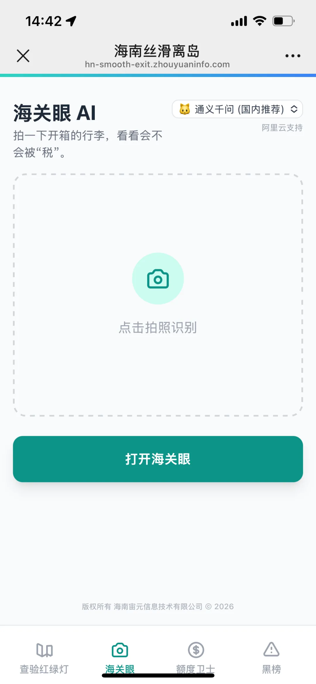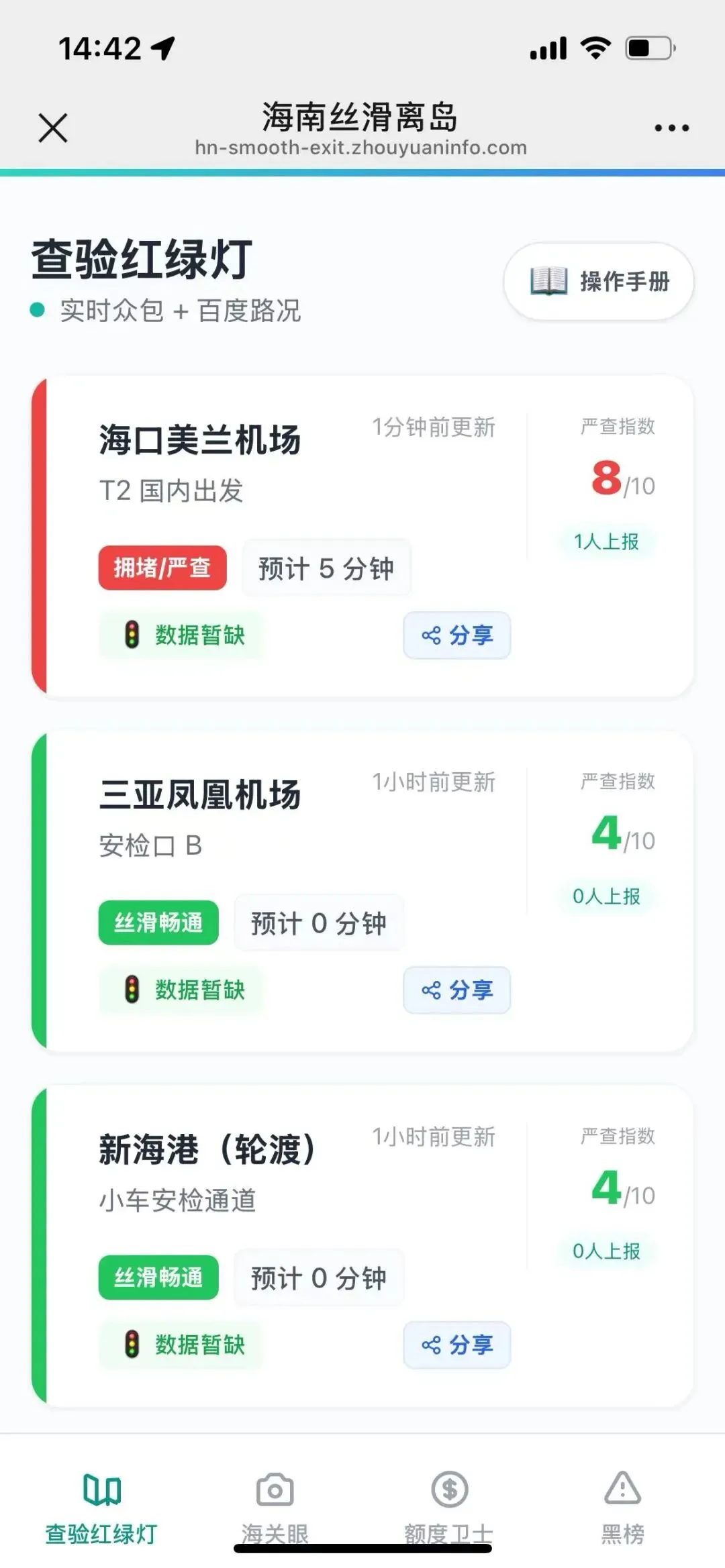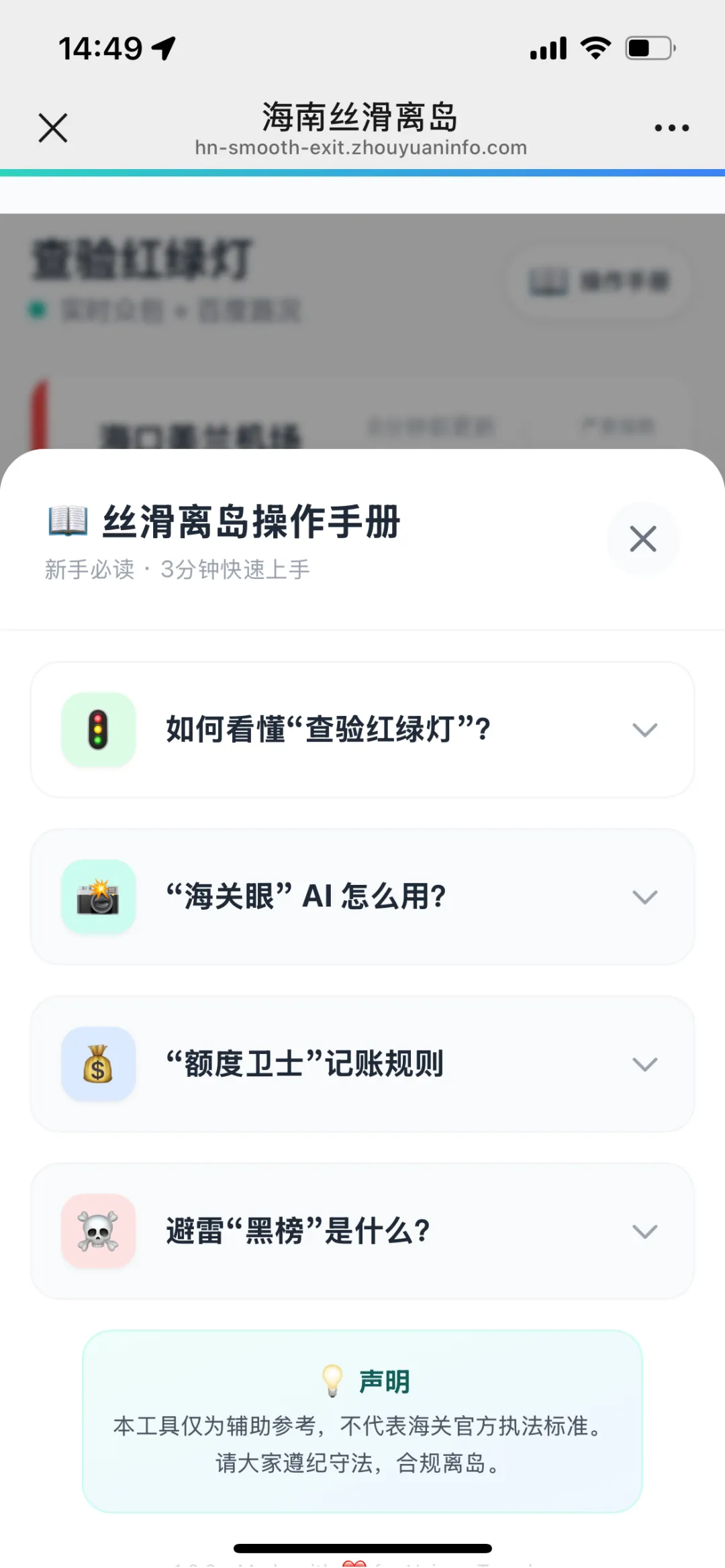 3.1 第一步:出发前看红绿灯打开「查验红绿灯」,看看你要去的口岸现在是什么状态,红色就错峰,绿色放心出发。3.2 第二步:收拾完箱子拍一张打开海关眼,给你的行李箱拍一张照片,AI几秒钟就帮你识别清楚哪些东西要申报,超不超标。3.3 第三步:认可结果加入额度识别没问题了,点击”加入额度”,自动记入你的年度账单,剩余额度自动更新。3.4 第四步:出发前查查黑榜想买东西之前,先搜一搜这家店/这个物品在不在黑榜上,没问题再下单。整个过程不到两分钟,所有信息都清清楚楚,出发自然心中有底。—四、使用建议:让你的过关更顺畅基于大量用户的使用经验,给大家几个实用建议:4.1 出发前必看红绿灯出发半小时前看看状态,如果红色建议换关口或者错峰,能节省大量时间。4.2 收拾完就拍海关眼装箱完成马上拍,有超标还能调整,别等到了海关才发现。4.3 每次购物都记额度买完就加入账单,这样额度一直准确,不会到最后才发现超了。4.4 不确认的先查黑榜网购或者陌生商家购物,先查黑榜再下单,避免踩坑影响信誉。4.5 重要提示– 本工具仅供参考,最终查验结果请以海关现场为准– 请自觉遵守海关规定,如实申报– 信息来自用户众包,仅供参考还在为海南离岛免税过关排队而焦虑?快来试试「查验红绿灯」!从查询到上报,从AI识别到额度记账,我们让你的每一次出入境都丝滑、透明、有把握。点击下方链接立即体验:👉 点击这里打开查验红绿灯(复制以下链接到浏览器也可以打开:)`https://hn-smooth-exit.zhouyuaninfo.com`打开链接就能用,不用下载,不用安装,微信浏览器直接打开。如果你用了觉得好用,别忘了分享给身边经常去海南买免税的朋友!关注我们,获取更多海南过关实用信息,让你的每一次出行都顺顺利利!#查验红绿灯 #海南离岛免税 #过关攻略 #旅游工具 #海南旅游