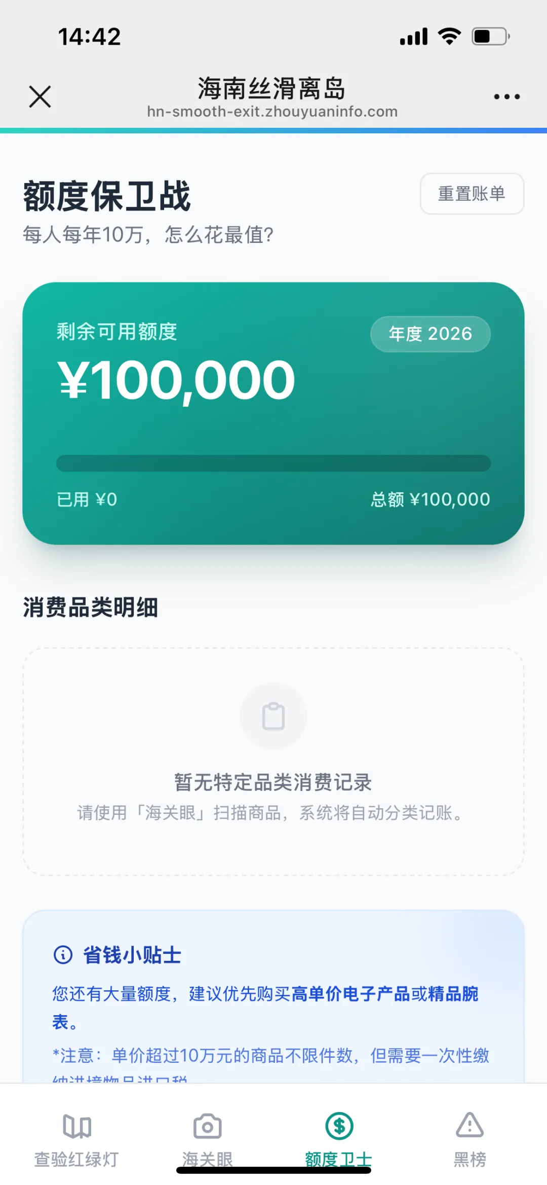 海南离岛免税额度为 10万元/人/年,系统自动帮你统计: